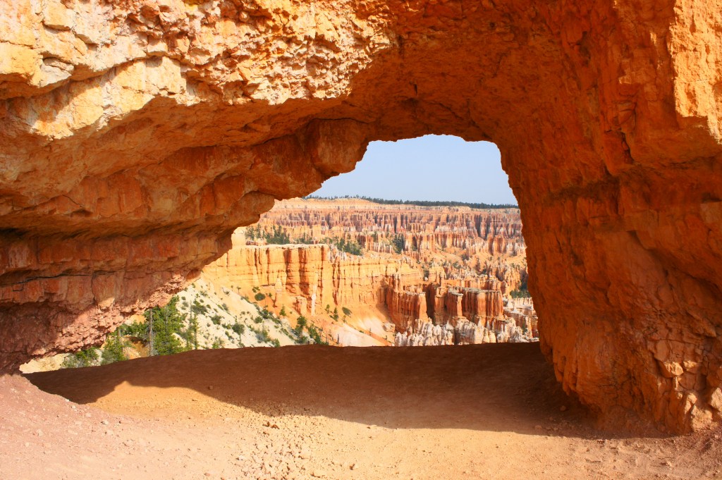 At around 3/10 mile, the chalky white gives way to deep orange and rounds a sharp switchback, high above a minor drainage dotted with the park’s iconic hoodoos, here relatively clumped together in lines. Now making its way northwest, the trail cuts through the first of several archways on the hike—presumably what gives “Peekaboo Loop” its name?—revealing views of a second drainage beyond.