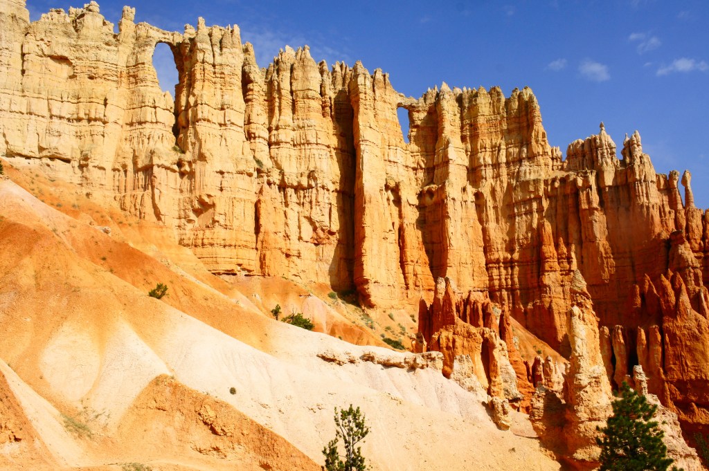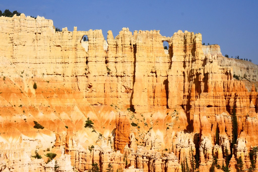At ¾ mile, the trail climbs to a saddle below Bryce Point (the overlook is visible overhead), leading into a third drainage and inaugurating another steady descent. From here the trail traces around a set of long switchbacks, with the Wall of Windows coming into clear view to the west. The imposing skyline reveals two sandstone arches, a prominent icon of Bryce Canyon.