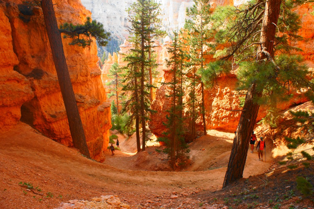 The first uphill brings hikers to the Wall of Windows benchmark, a wayside at the base of the two arches. From here the Peekaboo Loop descends into another dry wash and repeats the uphill again, climbing steadily up through a narrow notch. The winding switchbacks here resemble the wiggles of Wall Street, a scenic section of the nearby Navajo Loop Trail. The ravine is interspersed with towering ponderosa pines and Douglas firs, adding a touch of green amid the sea of red-orange.