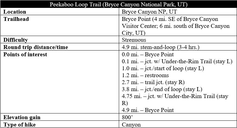 The main attraction and most spectacular portion of Utah’s Bryce Canyon National Park is the sweeping and colorful Bryce Amphitheater, which spans an area roughly 12 miles long, 3 miles wide, and 800 feet deep. Here the Pink Cliffs, composed primarily of Claron Formation limestone, yield dramatically to a wonderland of multi-hued hoodoos, spires, and deep fissures. Doubling as a horse and hiker’s trail, the Peekaboo Loop Trail forms a circuit through a particularly majestic section of the amphitheater; though still one of the park’s most popular hikes, the nearly 5-mile stem-and-loop hike sees fewer visitors than the nearby Navajo Loop and Queens Garden Trails, owing to its relative rigor and distance from the park’s main overlooks.