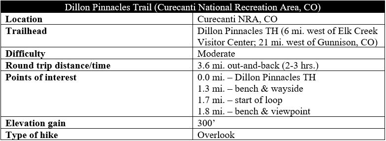 The Dillon Pinnacles Trailhead is situated near the middle of Curecanti National Recreation Area, roughly six miles west of the Elk Creek Visitor Center and just north of the point—Middle Bridge—where Highway 50 crosses Blue Mesa Reservoir, the largest lake located entirely within Colorado and a marvel of engineering formed by damming the Gunnison River in 1966. The parking lot at Dillon Pinnacles is small and includes a pit toilet.
