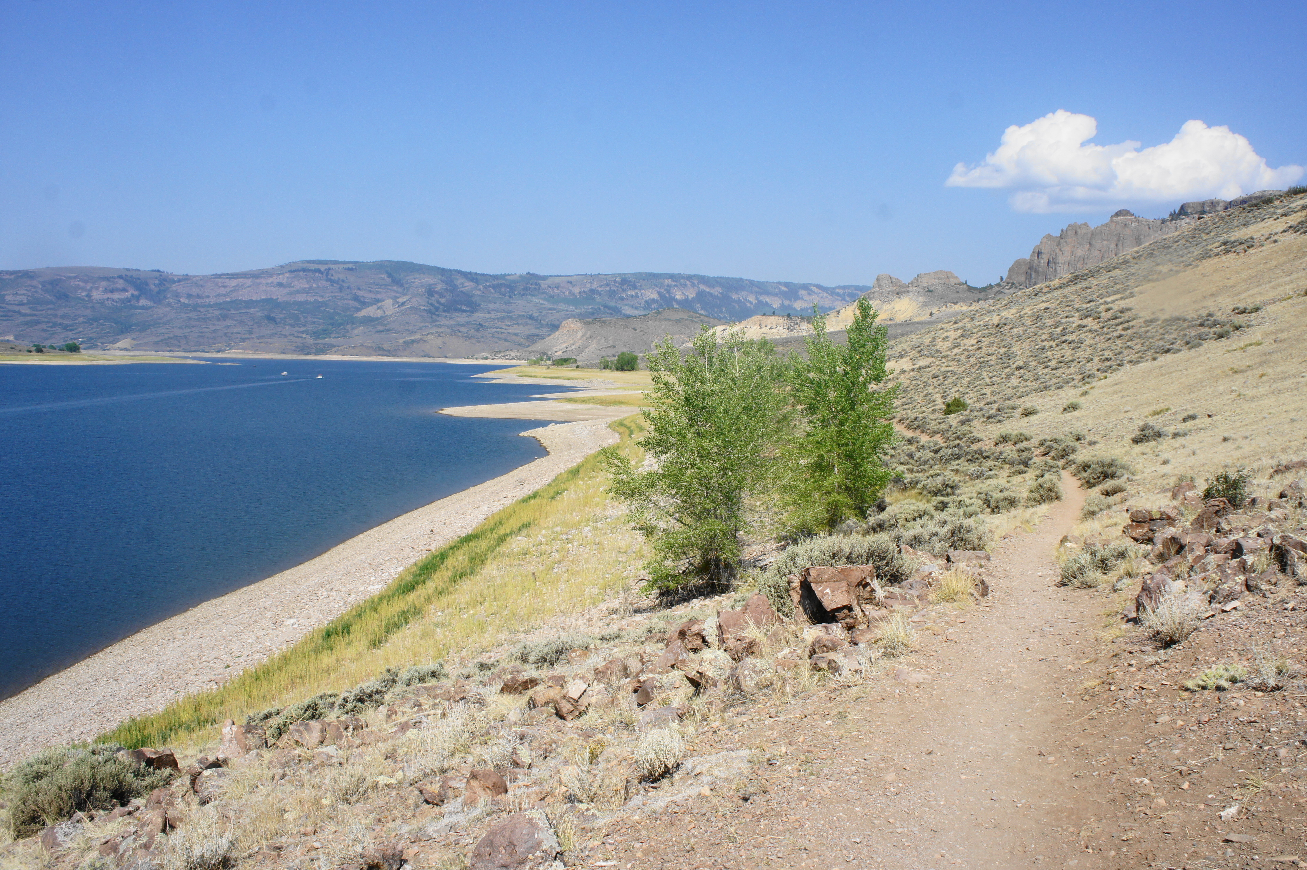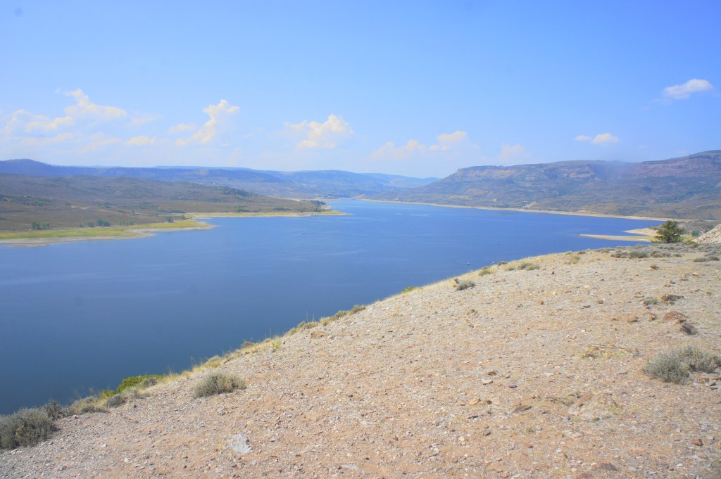 After a brief uphill, the trail hugs the left flank of the dry gulch, a riparian mix of oaks, pines, cottonwoods, and junipers. This area provides the hike’s first real shade, a welcome relief on a hot summer day in this often arid and sunny part of Colorado. Bearing north, the high tops of Dillon Mesa dominate the skyline. The trail begins to climb steadily, levelling off briefly under the shade of large pine tree at about 0.95 mile, where there is a bench available for hikers to catch their breath. Shortly afterward, the track makes a left-hand turn and heads west, climbing out into the open to clear a low plateau, now about 300 feet above the level of the reservoir.