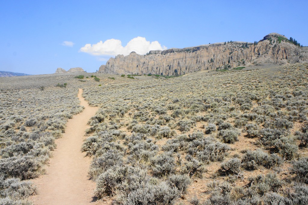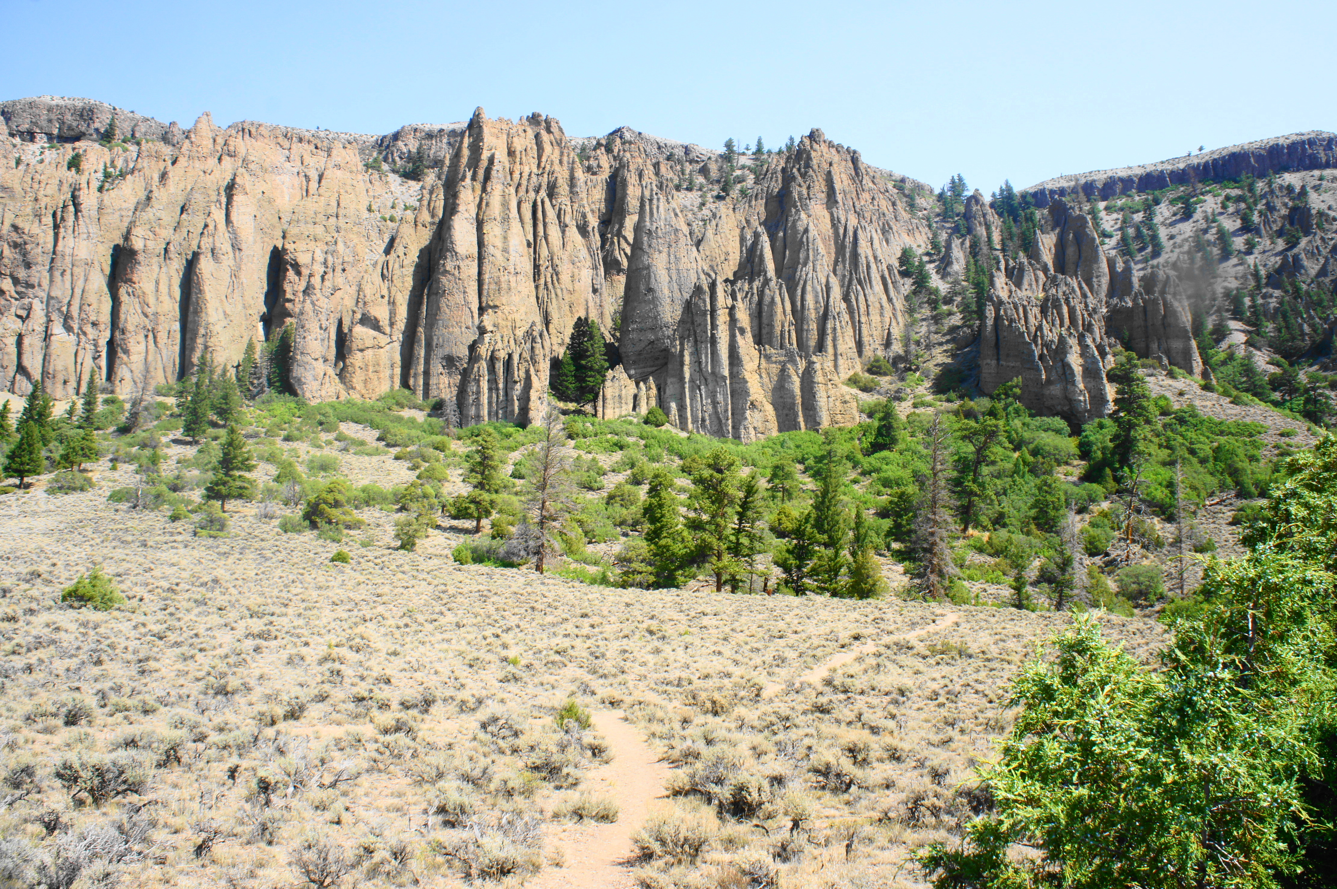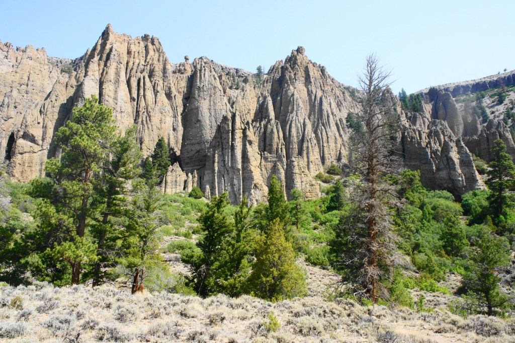 Moving forward, the trail continues westward, briefly descending before climbing mildly again, with ponderosa pines increasingly dotting the landscape. At 1.65 miles, there is another bench on the right, then the trail climbs out of the woods and back among the exposed sagebrush. At 1.7 miles, hikers reach the final section of the hike: a short loop that leads to the final overlook. Heading right first, hikers can visit a pinnacle-in-miniature, a speckled knob perhaps three feet high that was once perhaps a high spire like those visible along the wall to the north. A wayside offers more details on the forces of erosion that are causing the breccia formations to gradually crumble.