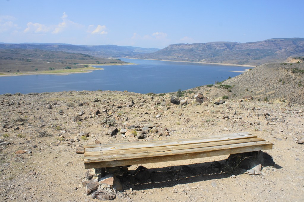 A couple minutes later, hikers reach the culmination of the hike—a bench with a fine view across Blue Mesa Reservoir, with the often snow-capped San Juan Mountains visible in the distance to the south.