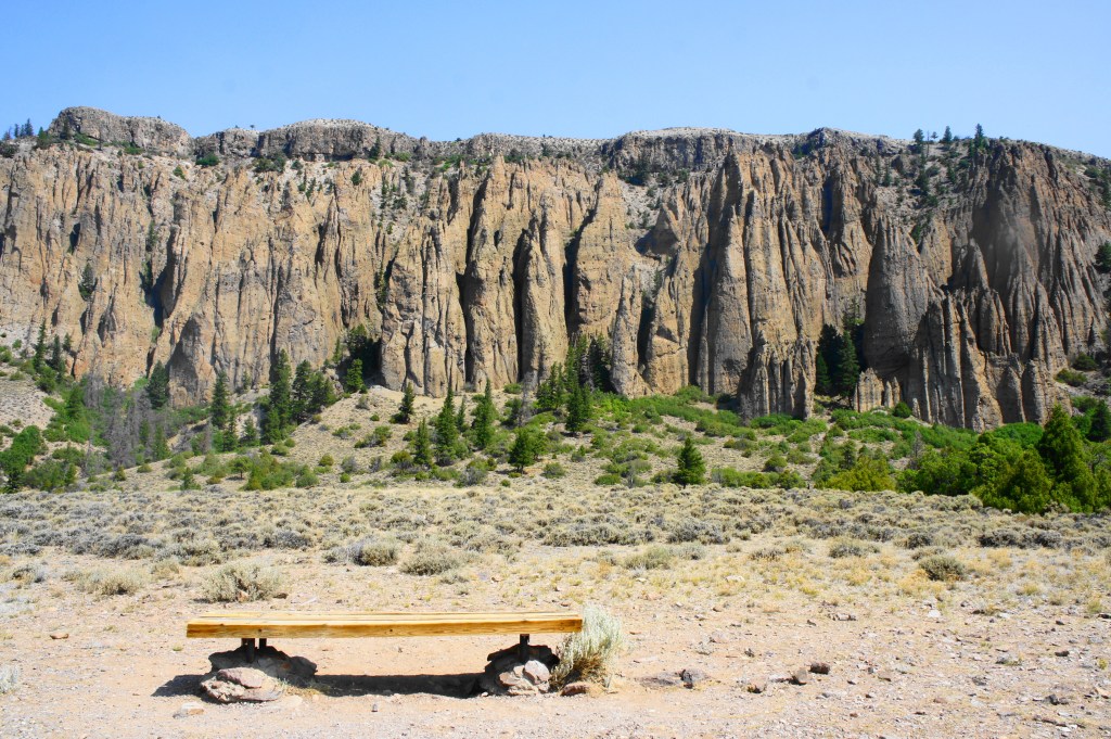 At 1.3 miles, there is another bench and fine vistas of both the reservoir and the pinnacles. Another wayside offers explanation for how the spires were formed: the relatively hard cap of Blue Mesa tuff keeps the walls in place, while the forces of wind, water, and ice have chipped away at the underlying breccia, forming the chiseled, gray-brown pinnacles visible ahead.