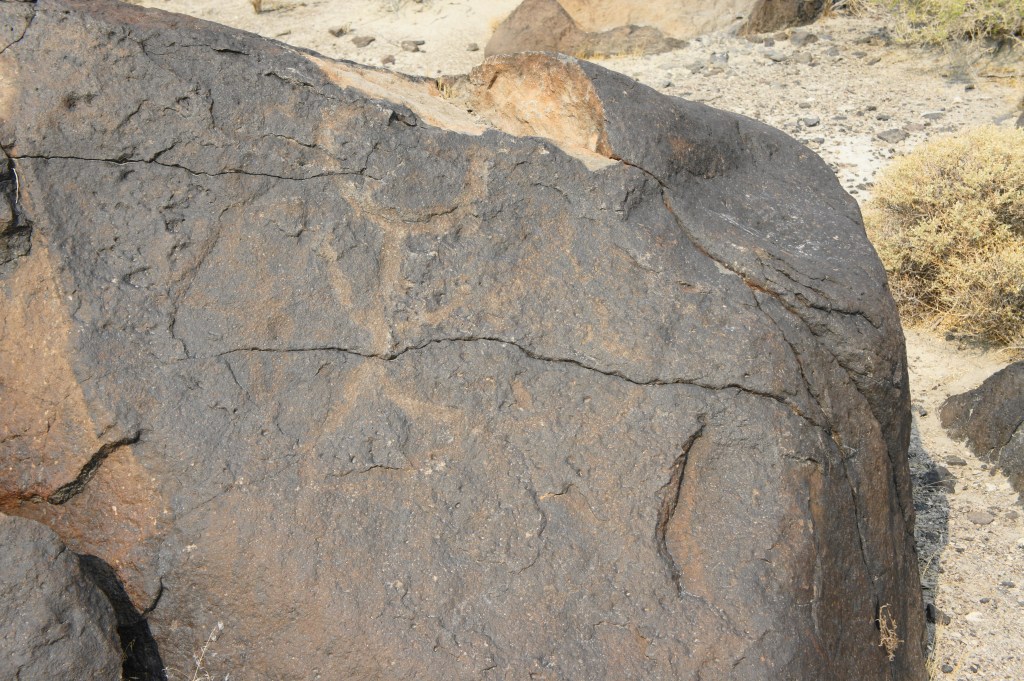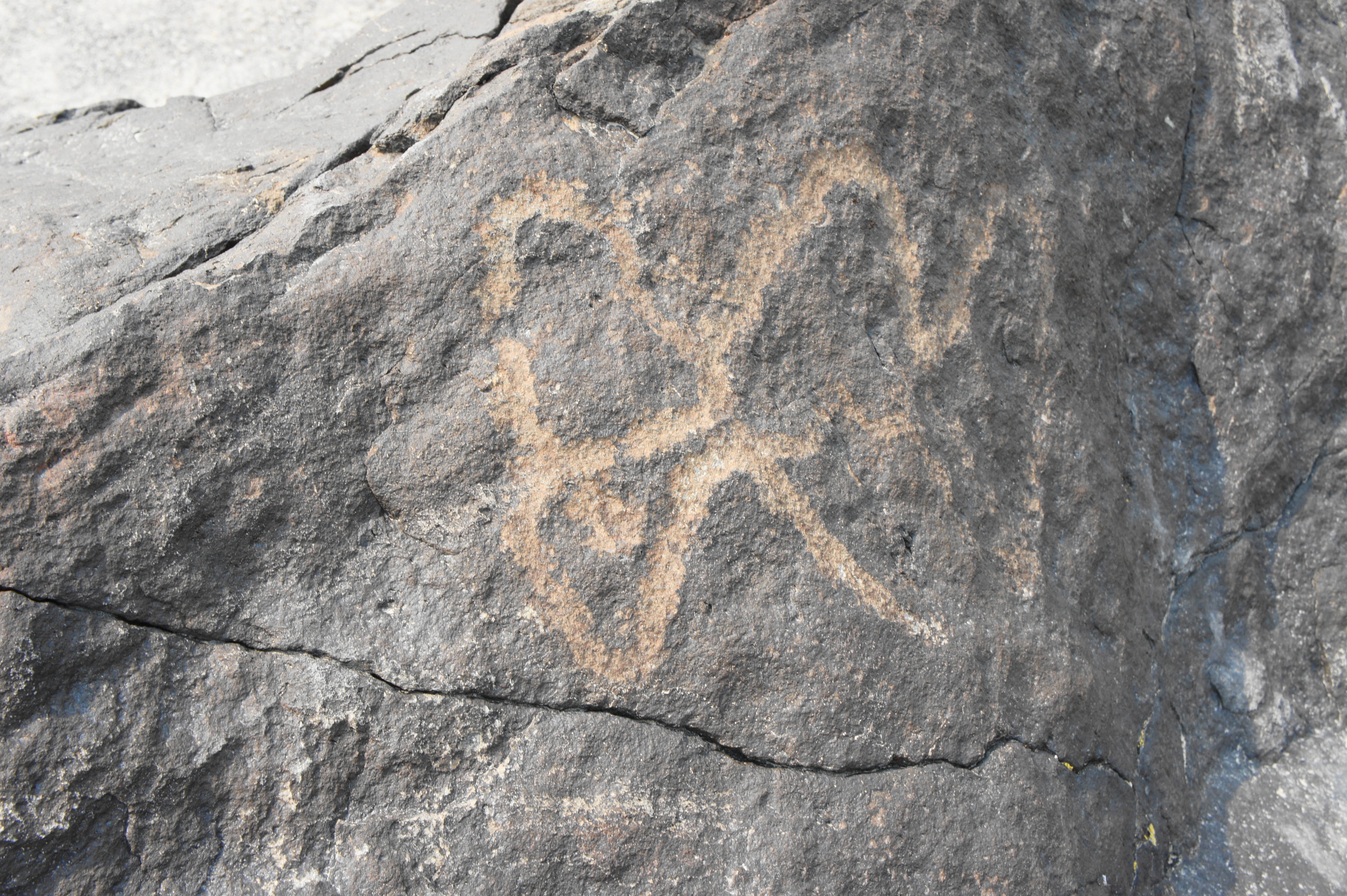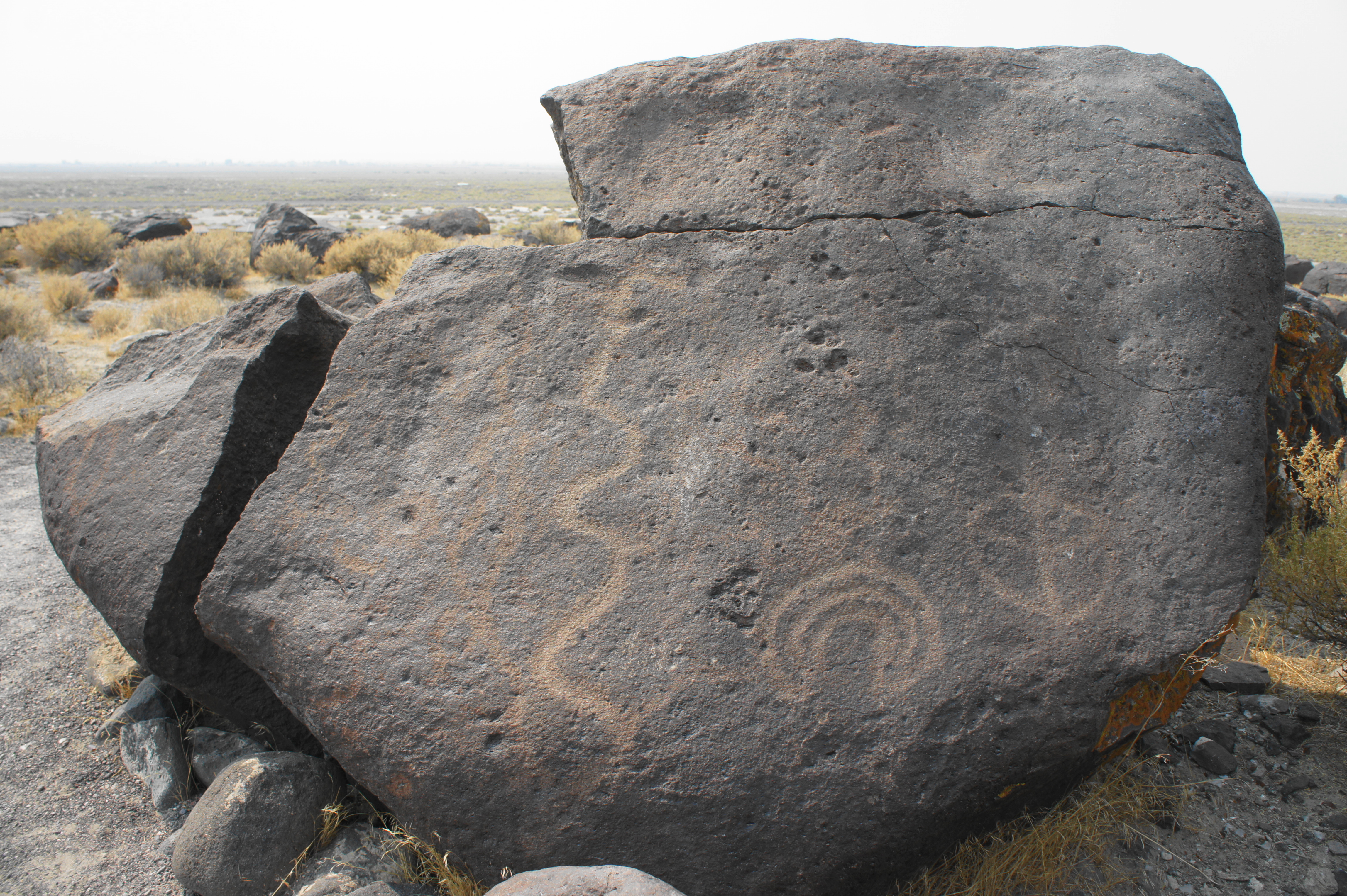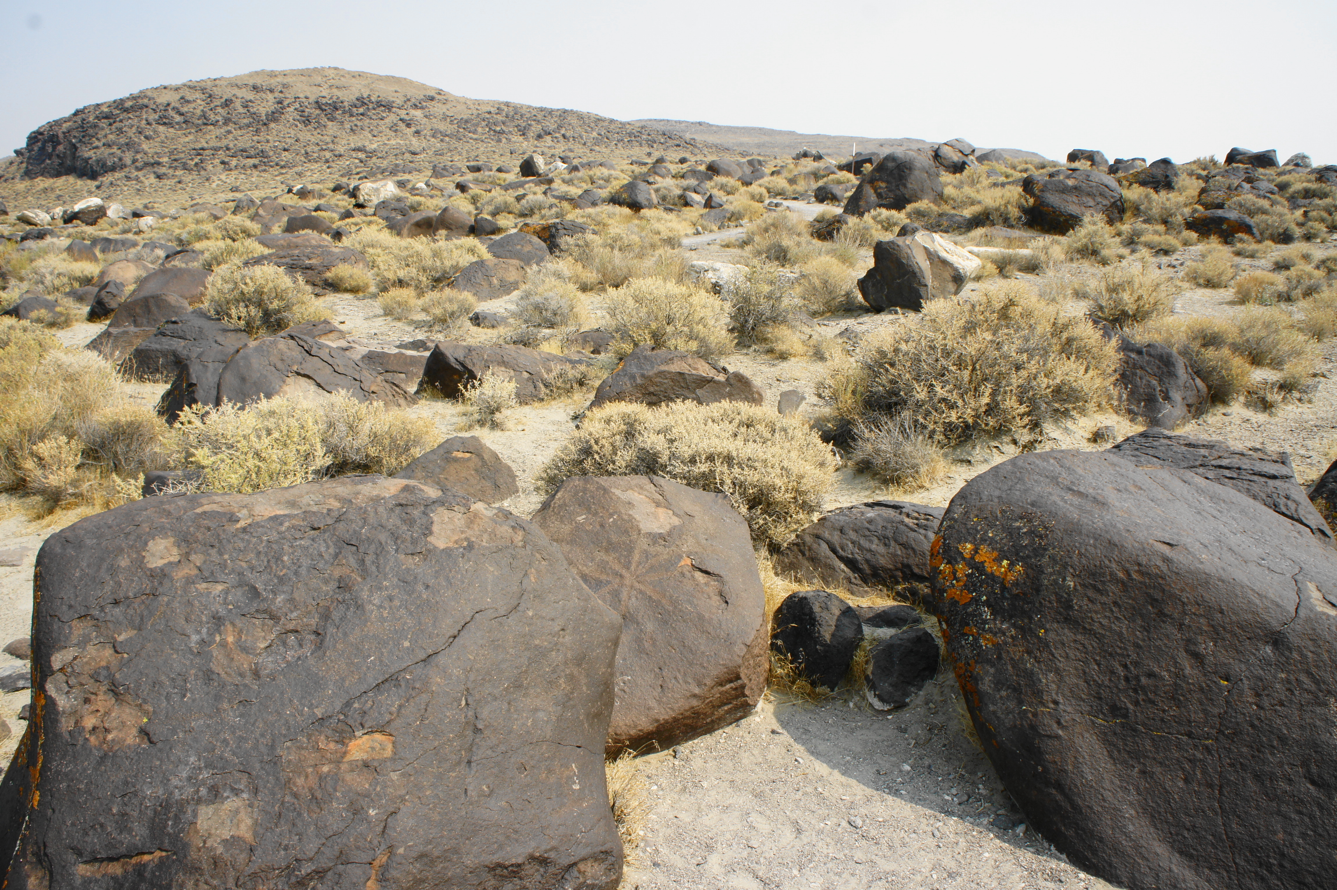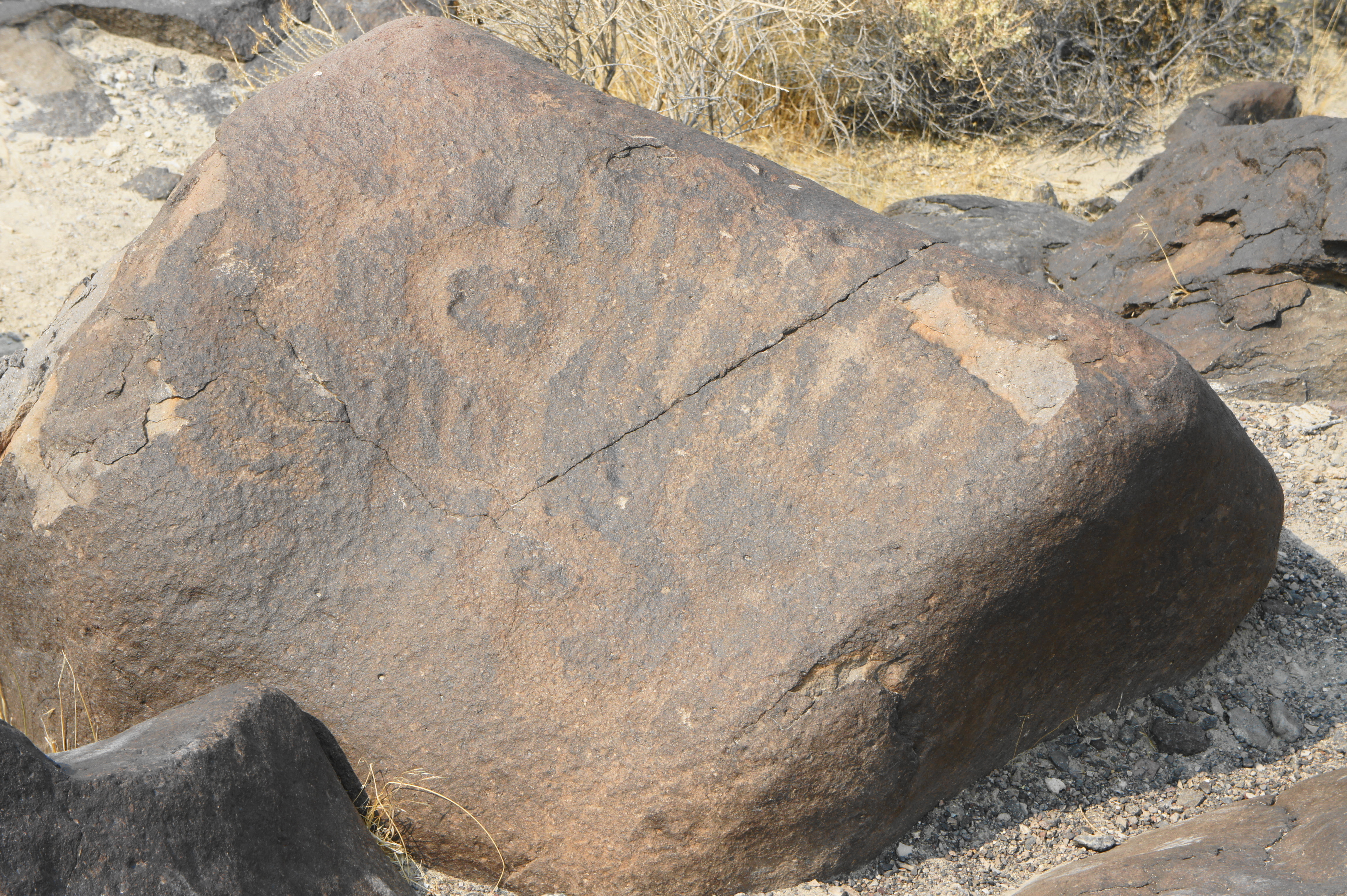 After a gentle climb, the first petroglyphs begin to appear amid the rock field of basalt boulders. The first of several interpretive signs—titled “Lasting Impressions”—helps visitors point out and interpret the carvings. The pockmarked holes in the nearby boulder are potentially up to 7,000 years old and typify what archaeologists have dubbed the “Pit and Groove” technique. There are also etched lines—much more common—that date to around 1,000-1,500 B.C. and take on the “Great Basin Pecked” style.