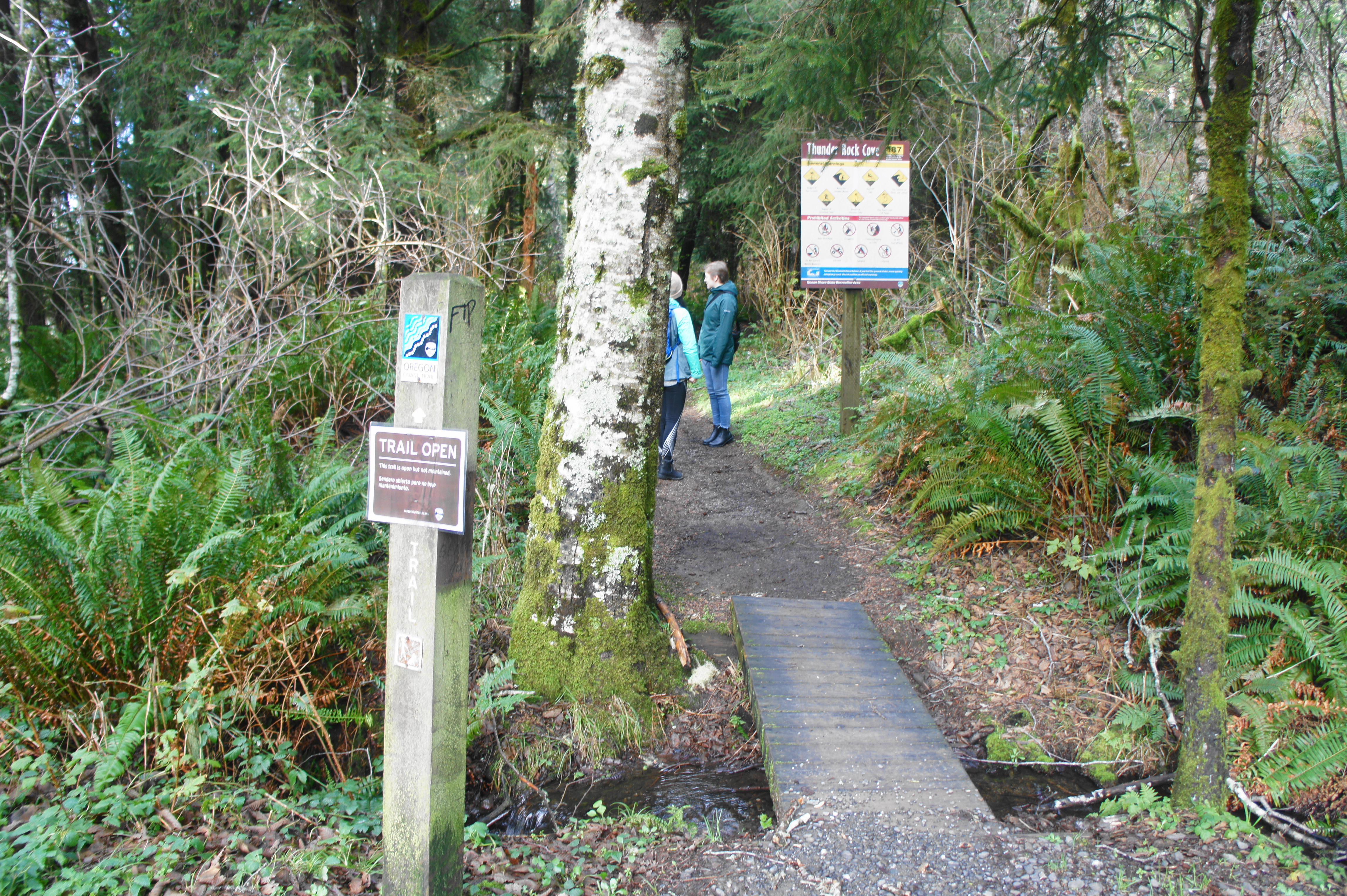 Take the path heading north from the parking lot: this is part of the lengthy Oregon Coast Trail, which transits the entire length of the Oregon shoreline. After traversing a short bridge and entering the spruce-and-fern-lined forest, bear left at the initial junction. (Note: Many hikers head right to reach nearby Secret Beach, a longer and more arduous hike.) Beyond, there are several spurs off to the left, leading to vistas of Thunder Rock Cove (a.k.a. Seal Cove), where the swirling sea cuts through a natural bridge carved in the ancient rock below. This picturesque spot is tantalizingly beautiful, with the turquoise waters lapping up against sheer vertical rock faces.