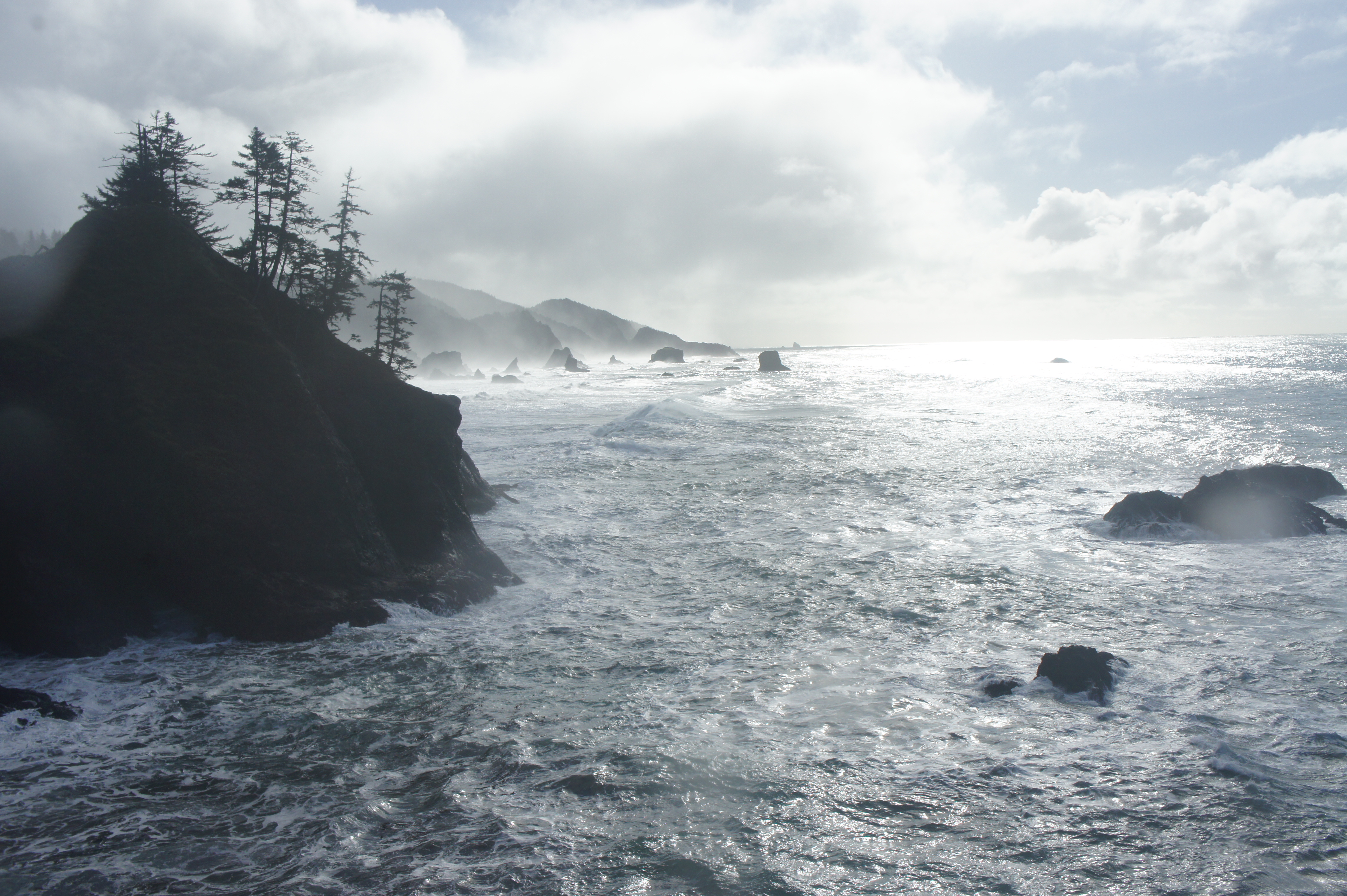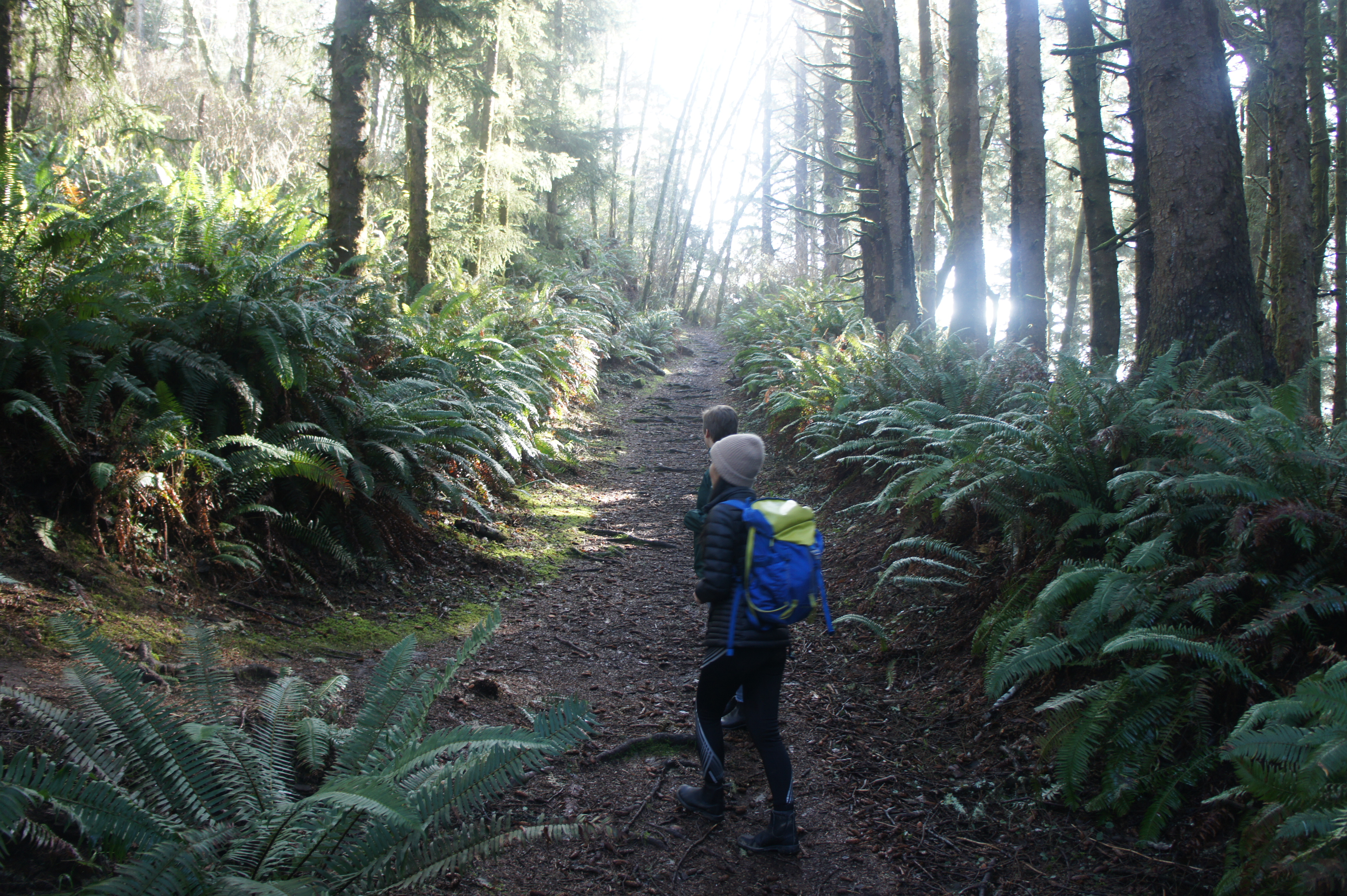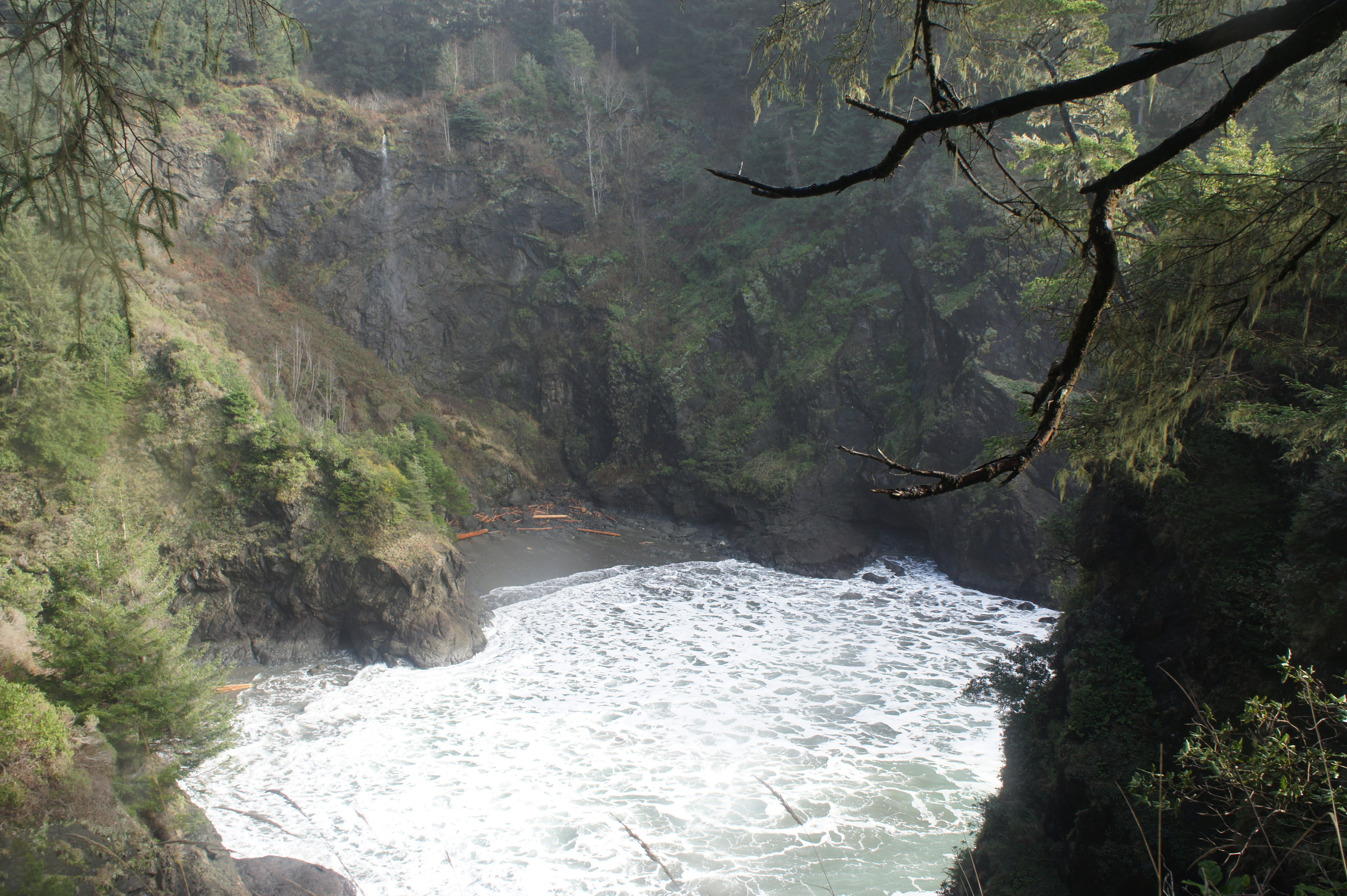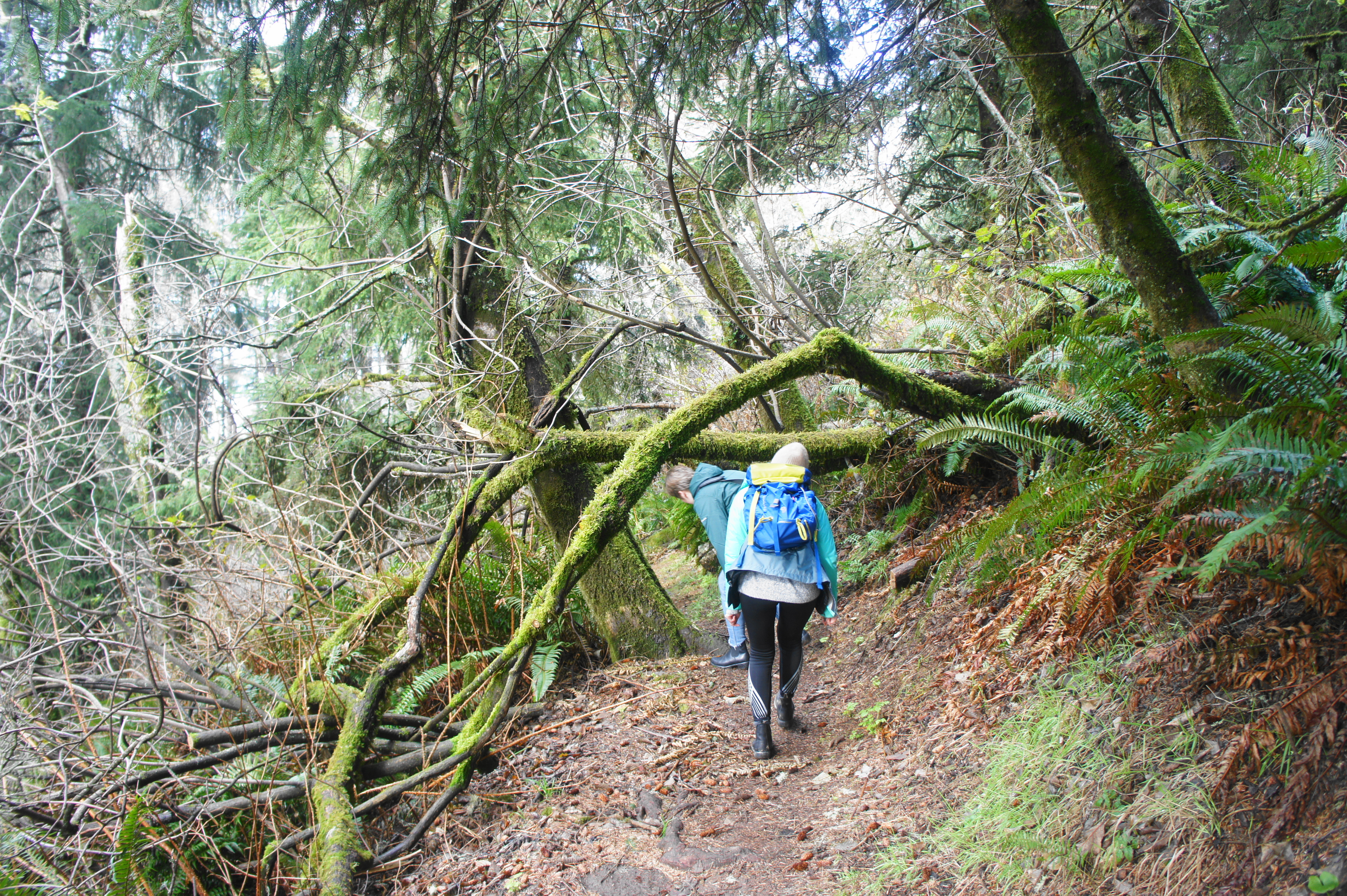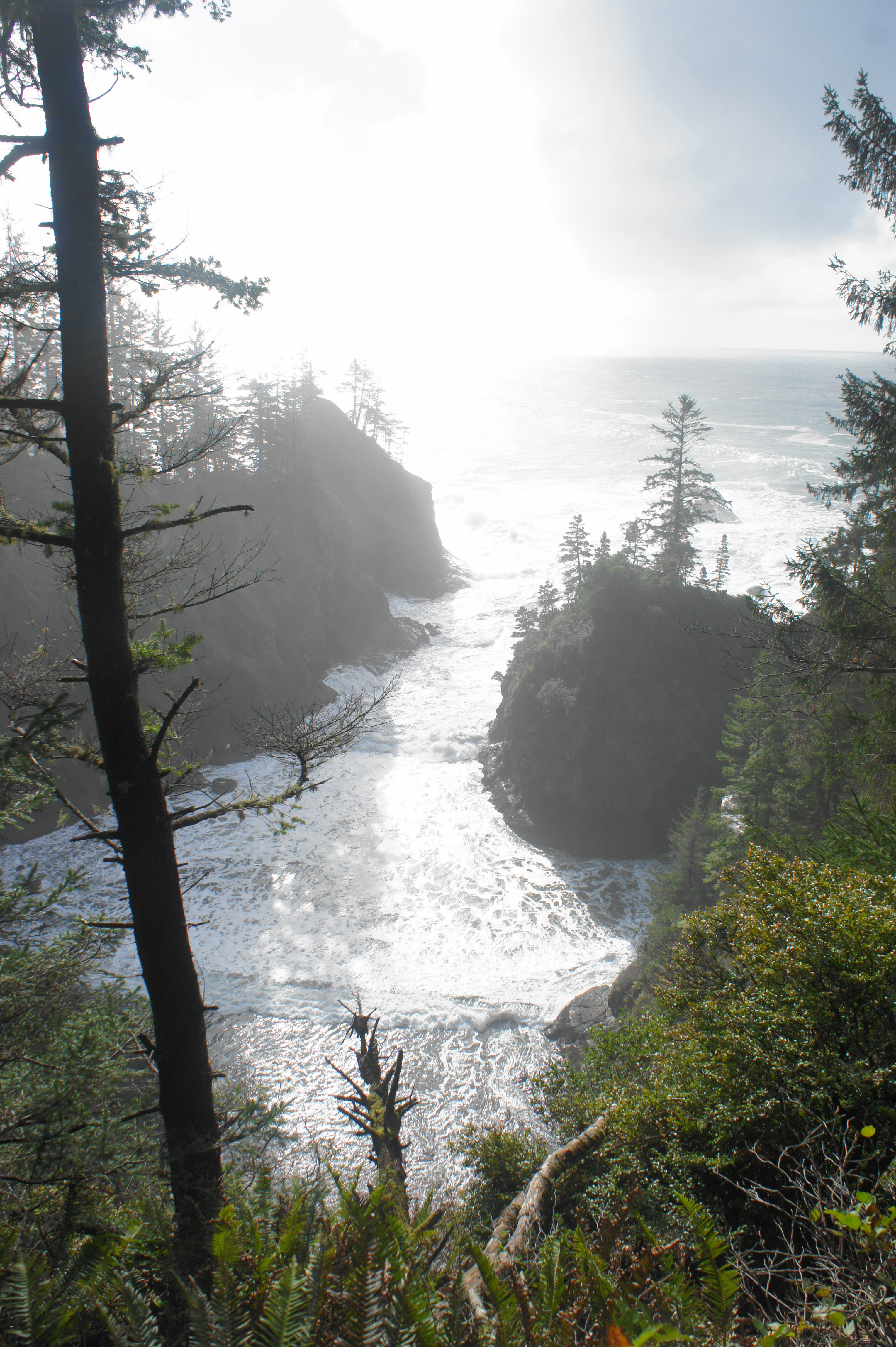 Intrepid hikers can continue out—sharply downhill—to the natural bridge, but most hikers will want to continue northward from the peninsula, following a narrow but discernable trail that hugs the cliffsides. The rest of the hike has no real ocean views but cuts through a dense forest of Sitka spruces and other conifers, with the understory lined by sword ferns.