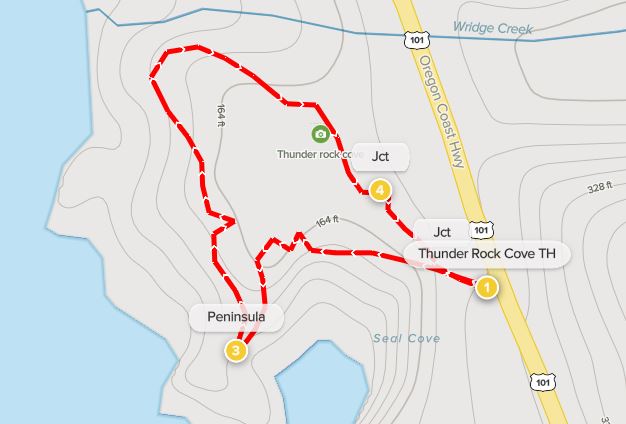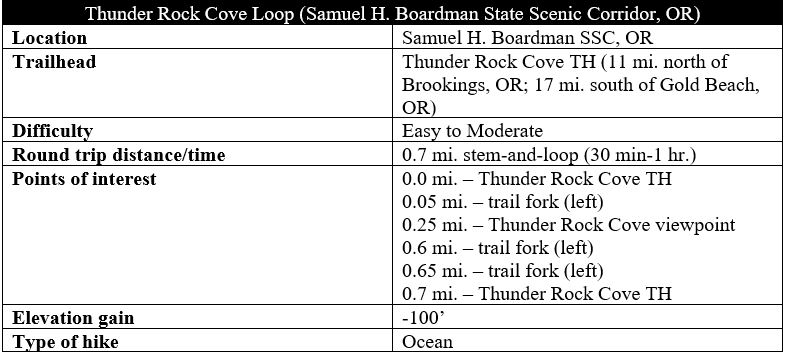 Start and end the brief Thunder Rock Cove Loop at the Thunder Rock Cove Trailhead, an unmarked but popular parking area along Highway 101 (Oregon Coast Highway) (mile marker 347.8), roughly 11 miles north of Brookings and 17 miles south of Gold Beach. The graveled turnoff is situated just north of the signed pullout for Natural Bridges and features a large trail marker that indicates you are in the right place.