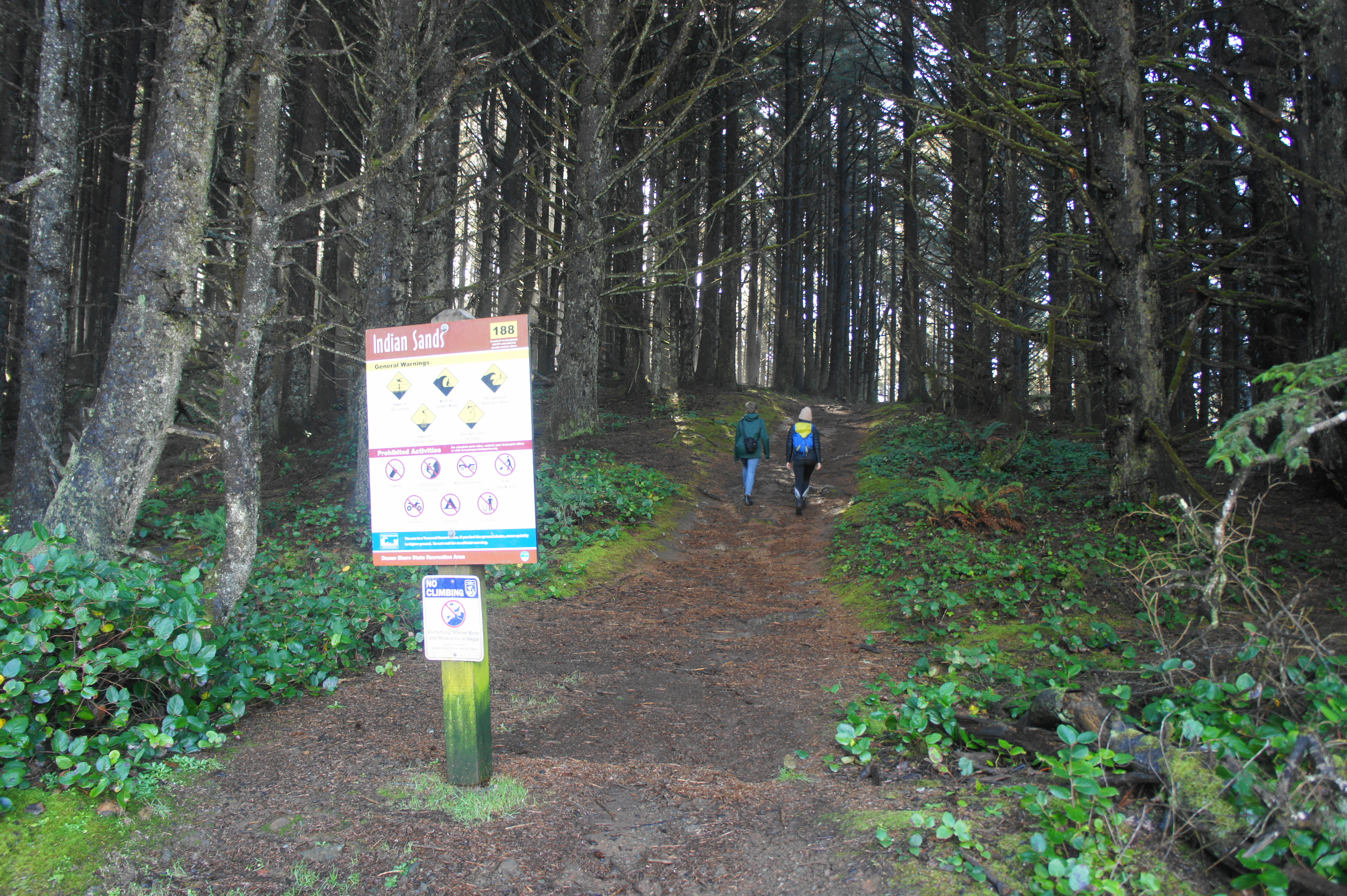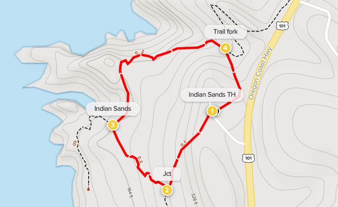 Heading in a northwesterly direction, the Coast Trail passes a neon-green sign on the right (titled “188”—used to signal one’s location in case of an emergency) and then leaves the dense stand of stubby shore pines behind. Ahead is the heart of Indian Sands, an attractive, cliffside shelf of gently sloping dunes. Here, footsteps fan out in nearly all direction, and the main track is temporarily difficult to discern. But this is also a fantastic area to explore.