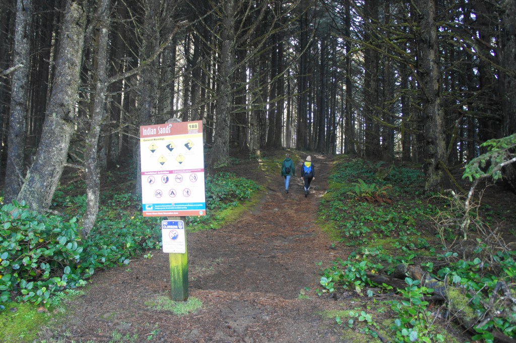 The large and gravel parking lot for Indian Sands is well-marked and situated roughly nine miles northwest of Brookings, Oregon and 19 miles south of Gold Beach in Samuel H. Boardman State Scenic Corridor. Park anywhere in the lot, but note that there are two trails that begin from this point: a wide, southbound route (after the entrance, to your left), which leads into a grove of tall Sitka spruce, and a northbound, narrower route, which is quickly enveloped by the dark forest. These are the start and end to the hike, respectively. Heading in the clockwise direction avoids a crushing ascent up a steep slope.