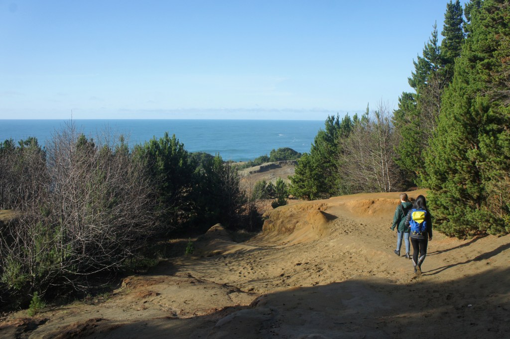 The downhill ends at a trail junction about 2/10 mile; head right on the Oregon Coast Trail, a nearly 400-mile route that traverses the length of the state’s rugged coastline. Continuing to decline, but at a much more gently clip, the trail quickly emerges into a clearing, where the dirt gives way to clumpy sand and views of the Pacific Ocean open up to the west.