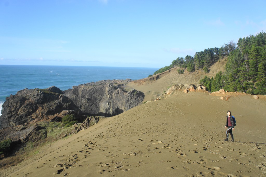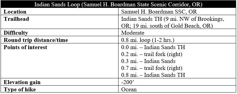 The Indian Sands area, situated near the middle of Samuel H. Boardman State Scenic Corridor, is a collection of crisp, windswept dunes, towering headlands, and thundering coves along the southern Oregon coast. Starting and ending at the Indian Sands Trailhead (mile marker 348.6 on Highway 101), a brief but beautiful circuit combines the sunny sands with thick forest cover, with terrific ocean views throughout much of the moderately-difficult hike.