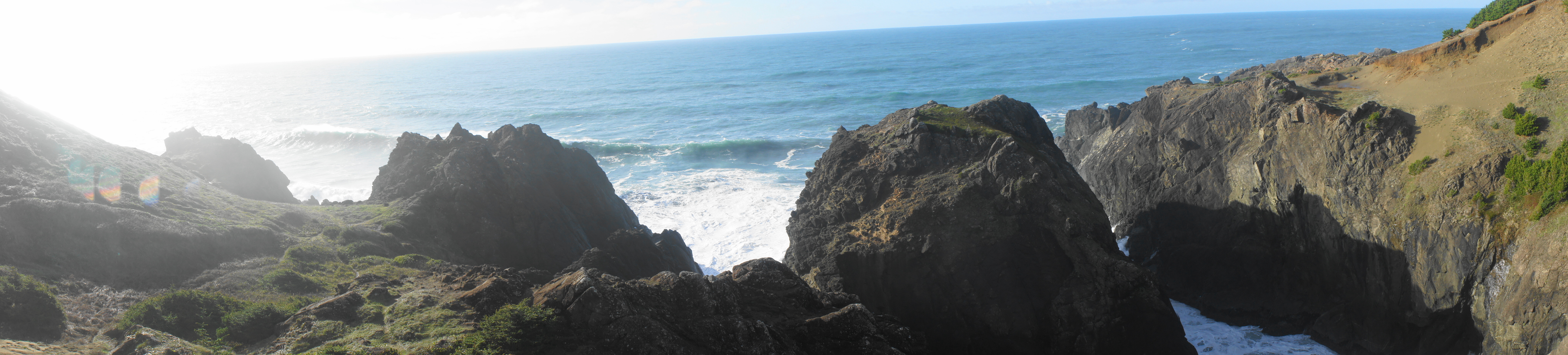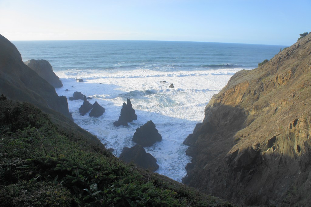 The onward track bears right (north), dropping to clear a sandy bowl before heading toward what appears to be a dusty passage between the main hillside and a rugged peninsula. The passage turns out to lead to a dropoff: the cliffs give way to another scenic inlet to the north, where a minor drainage drops sharply to the ocean, with several sea stacks just out to sea. One can also see north up the coast toward Thomas Creek Bridge, China Beach, Thunder Rock Cove, and the Natural Bridges area, although all are obscured by the jagged angles of the cliffs.