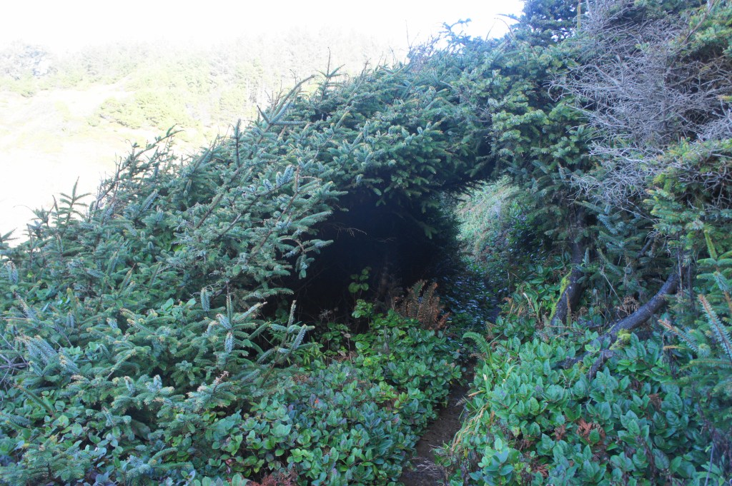 Even as the sands give way to impassable cliffs, the trail continues onward by cutting sharply to the right. Follow the footsteps leading up a narrow track that hugs the scrubby hillside, then runs through a trio of evergreen arches, formed by the windswept spruces that envelop the sea-facing slopes.