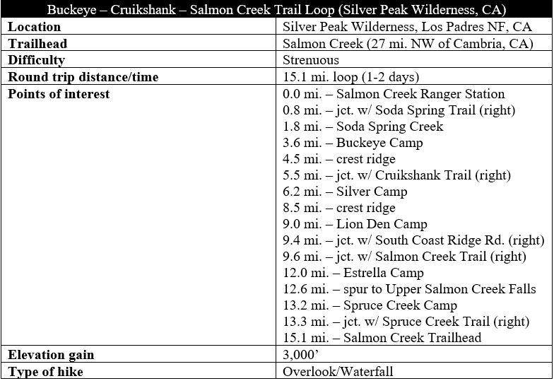 Buckeye – Cruikshank – Salmon Creek Trail Loop (Silver Peak Wilderness, CA)