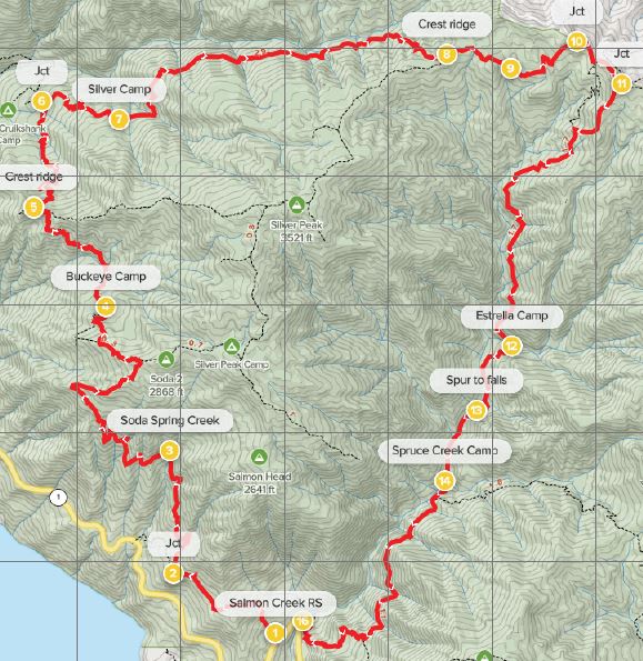 Map of Buckeye – Cruikshank – Salmon Creek Trail Loop, Silver Peak Wilderness, Los Padres National Forest; created using alltrails.com (Check out the PDF version and interactive map)
