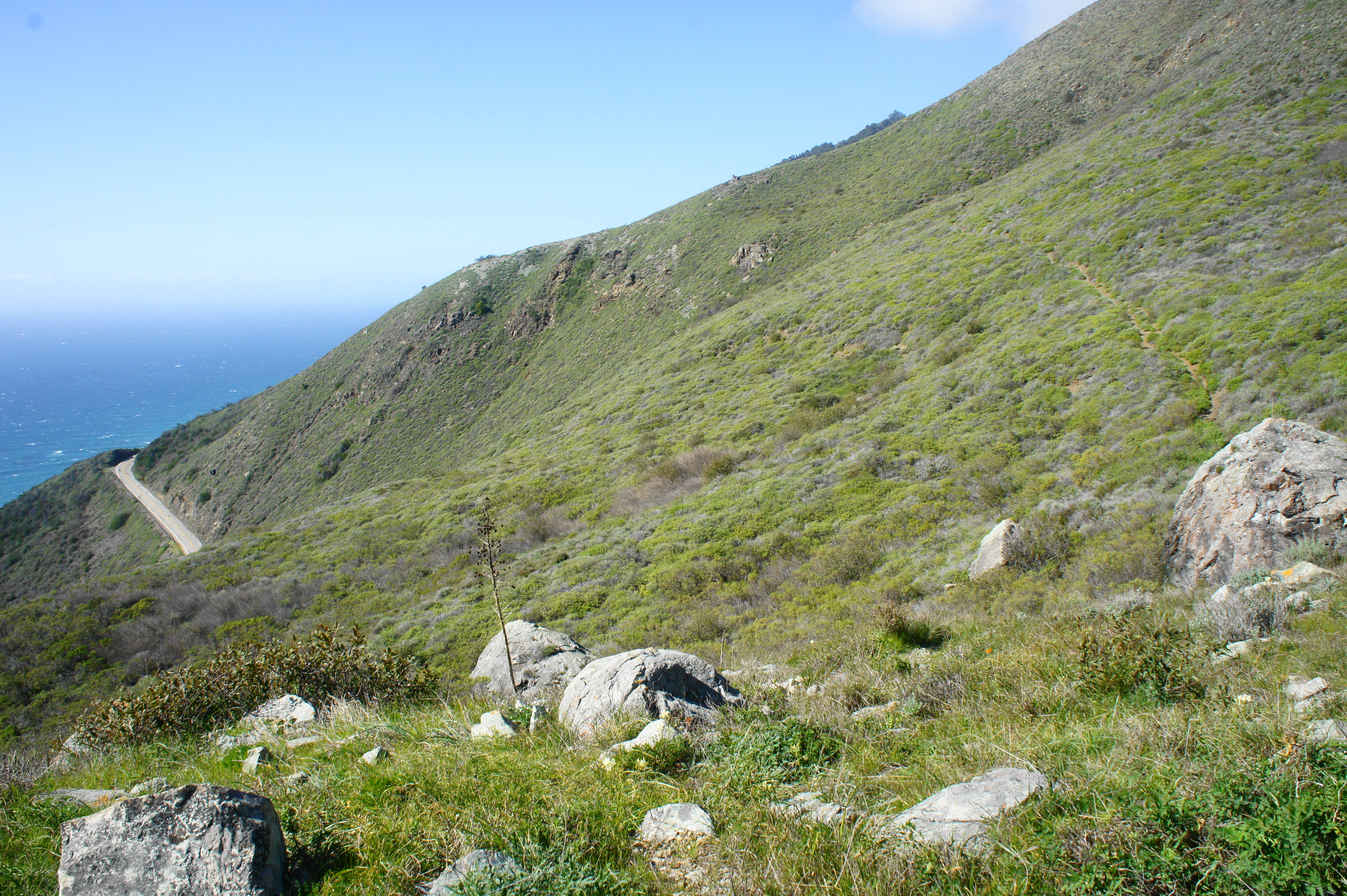 Once past the initial climb, the vegetation becomes much more subdued—with trees replaced by a mix of various short shrubs, as well as wild yucca plants that flower nicely in spring. As the Buckeye Trail continues westward, the steep slopes give way to Highway 1 several hundred feet below, with the crashing waves of the Pacific beyond. Hikers are thus spoiled almost right away with excellent vistas along what is one of the finest stretches of coastal trail in California.