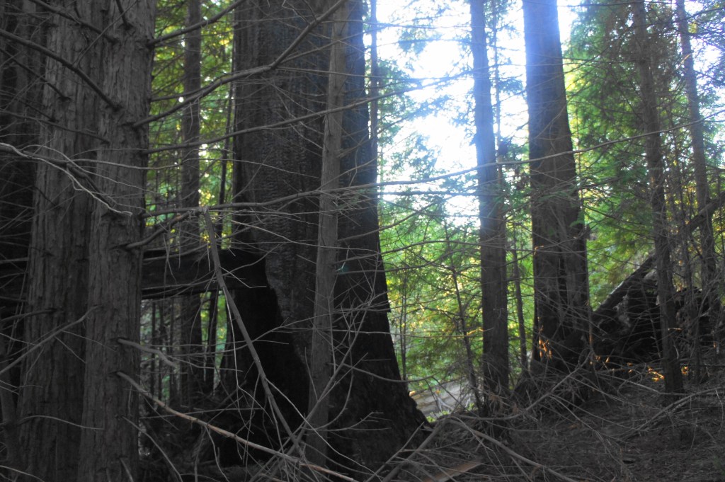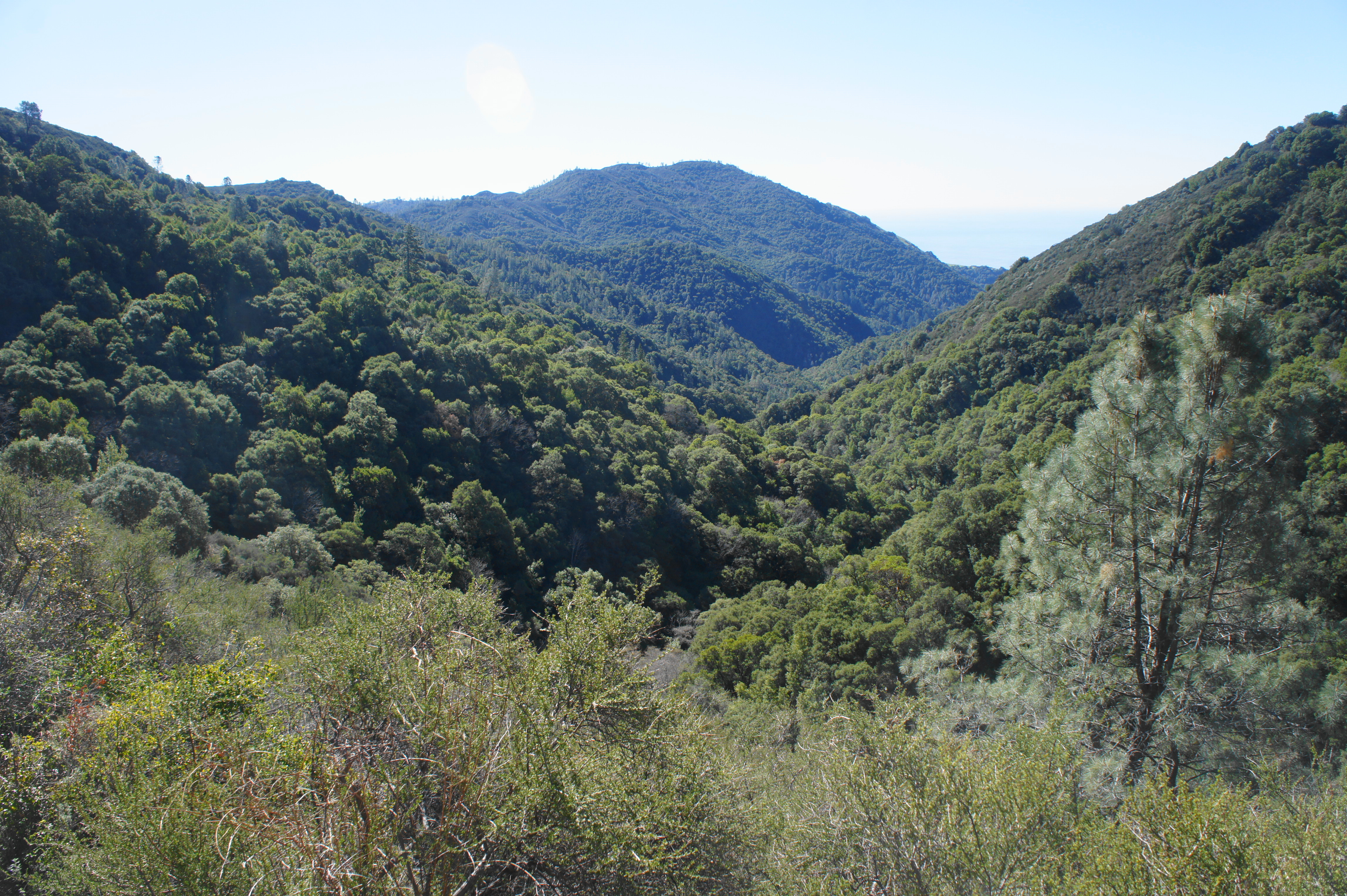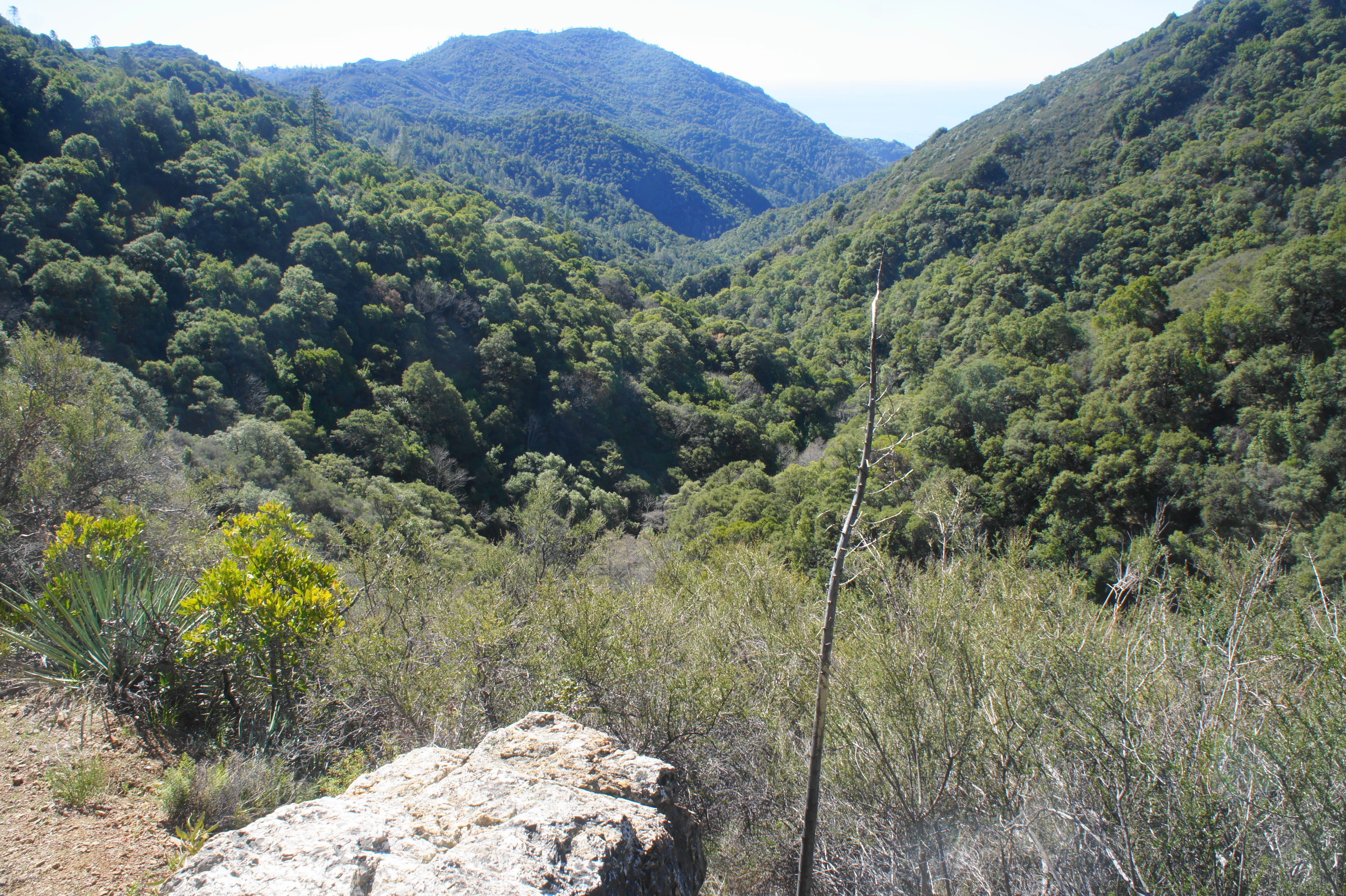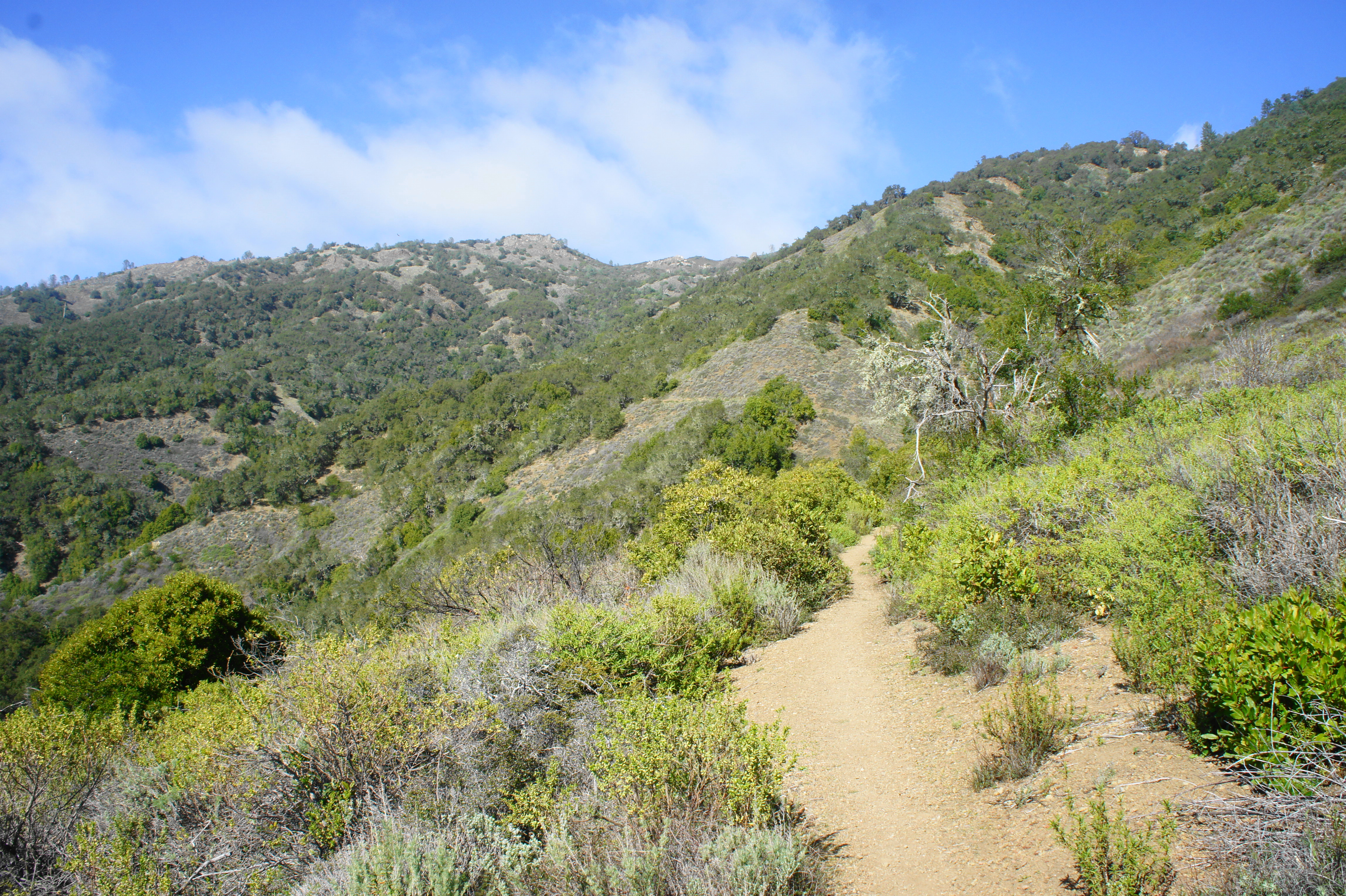 At 4.5 miles, a spur trail leads to a decent vista (and campsite) off to the left, but the main Buckeye Trail continues right, beginning a steady, winding descent into Villa Creek Canyon. Mostly wooded, there is not much to note about this section, except for one surprising sight just before the junction with the Cruikshank Trail at 5.5 miles: a small but pretty grove of coast redwoods off to the left. Silver Peak Wilderness marks the southernmost reach of these world’s tallest trees (the range extends all the way north to southwest Oregon).