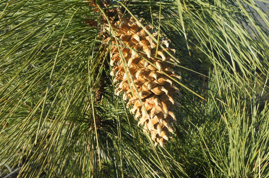 Now steeply ascending, the Buckeye Trail wanders into the first grove of Coulter pines—notable for their wispy needles and massive pine cones; Coulter pine cones are the largest and heaviest in the world. At 3.3 miles, the trail approaches an excellent vista point on the left that has likely been used as a campsite; from here the trail turns away from the coast briefly and begins a descent that sheds about 200 feet.
