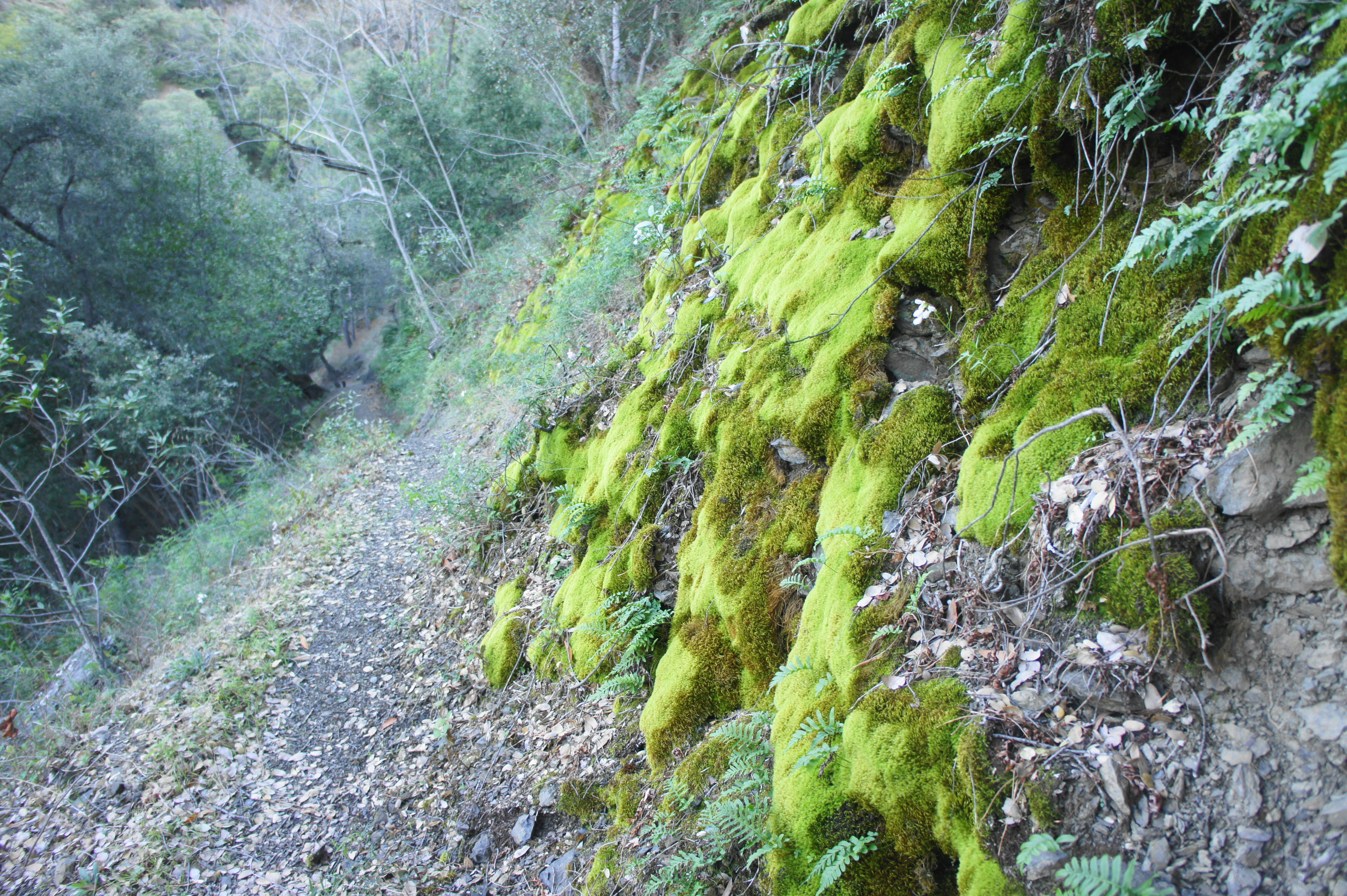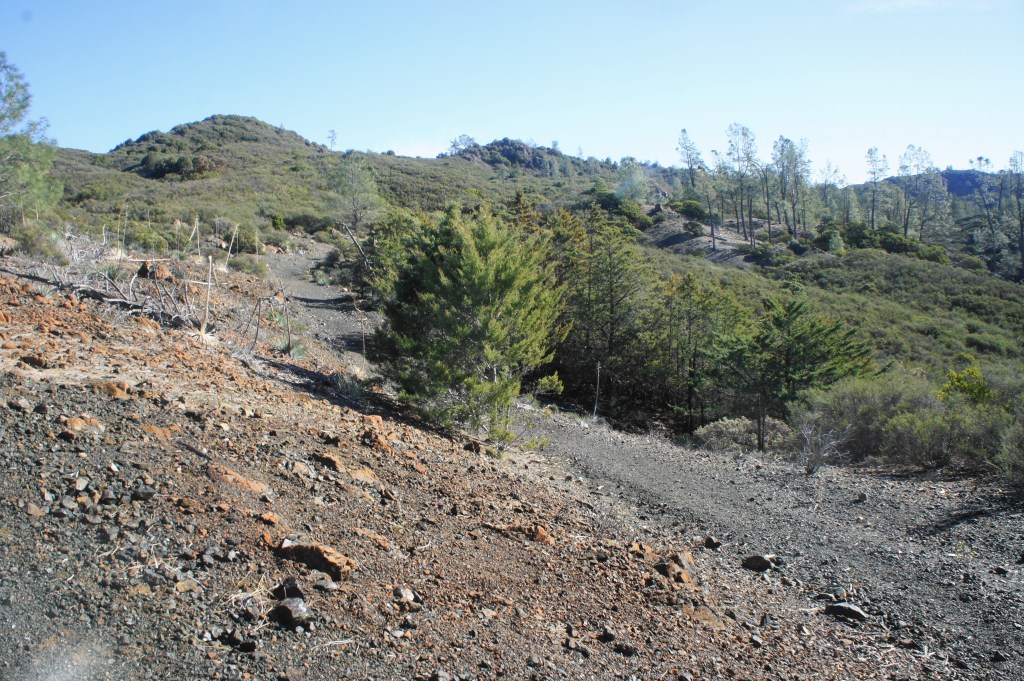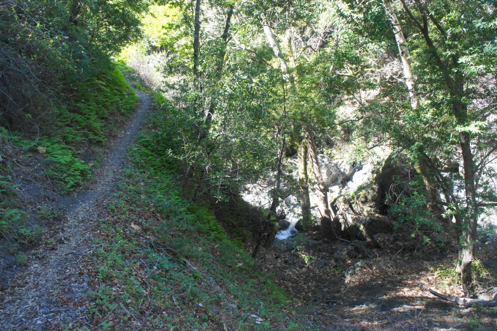 The next waypoint of interest after a relatively flat and scenic stretch is an opening in a small fence, with the first junction just beyond. Here the Soda Spring Trail joins from the left; stay right on the Buckeye Trail and continue into the Silver Peak Wilderness. The onward route returns to the shade of oak and bay trees, passing a drainage at 1.1 miles that, after rainfall, would form a nice waterfall. (Note: Even in February, however, this was dry.)