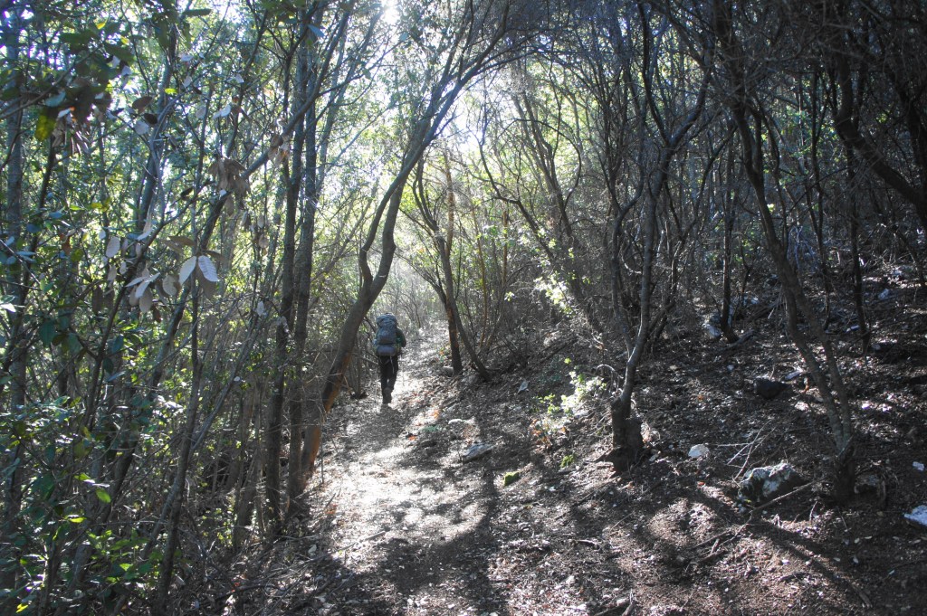Beyond Lion Den, follow the wide path as it continues east, then ascends rather sharply, culminating at a junction with the South Coast Ridge Road (a dusty, rarely-used track) at 9.4 miles. This marks the end of the Cruikshank Trail and leg two of the journey.