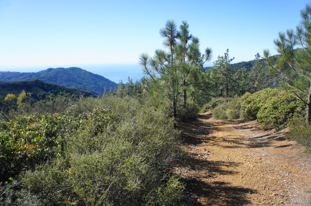 More limited vegetation allows for more open vistas, with hikers getting a peek back down Villa Creek drainage and ahead toward Lion Peak (3,499’) and the Salmon Creek drainage to the east. The trail also widens and even mildly descends as it snakes eastward across the scrubby chapparal. About 4/10 mile past the ridge, the route reaches Lion Den Camp, an excellent spot (though with a limited, seasonal water supply). While there are several disturbed sites at Lion Den, the best lies up the woody knoll to the right, which offers excellent views toward the coast.