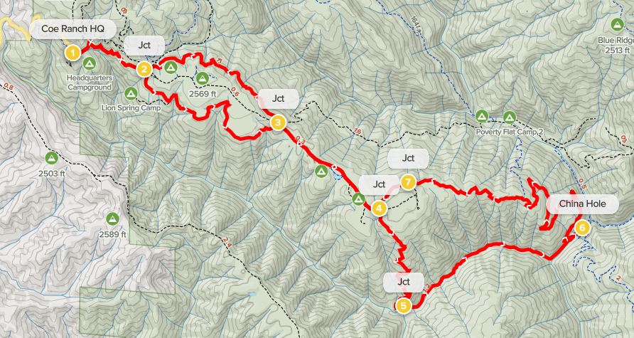 Manzanita Point Group Camps to Coe Ranch Headquarters (2.4 miles)