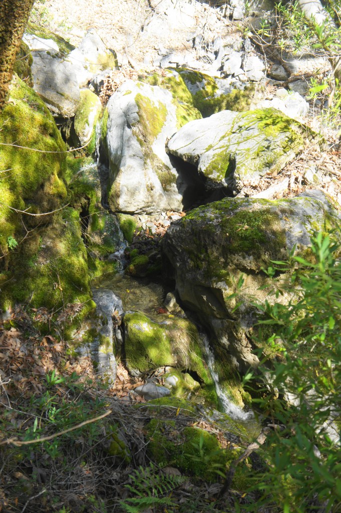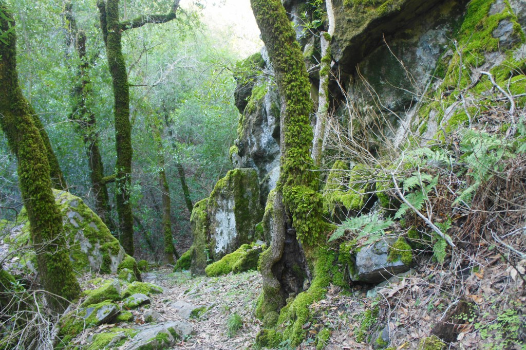 In the subsequent 7/10 mile, hikers will cross the creek 10 or 12 times as the canyon drainage becomes increasingly choked with moss-laden boulders. A rocky hollow with flowing cascades at around 4.3 miles is particular inviting. The narrow trail eventually settles back on the northern banks of the creek and passes the confluence with Coyote Creek (obscured from view) at about 4.5 miles.
