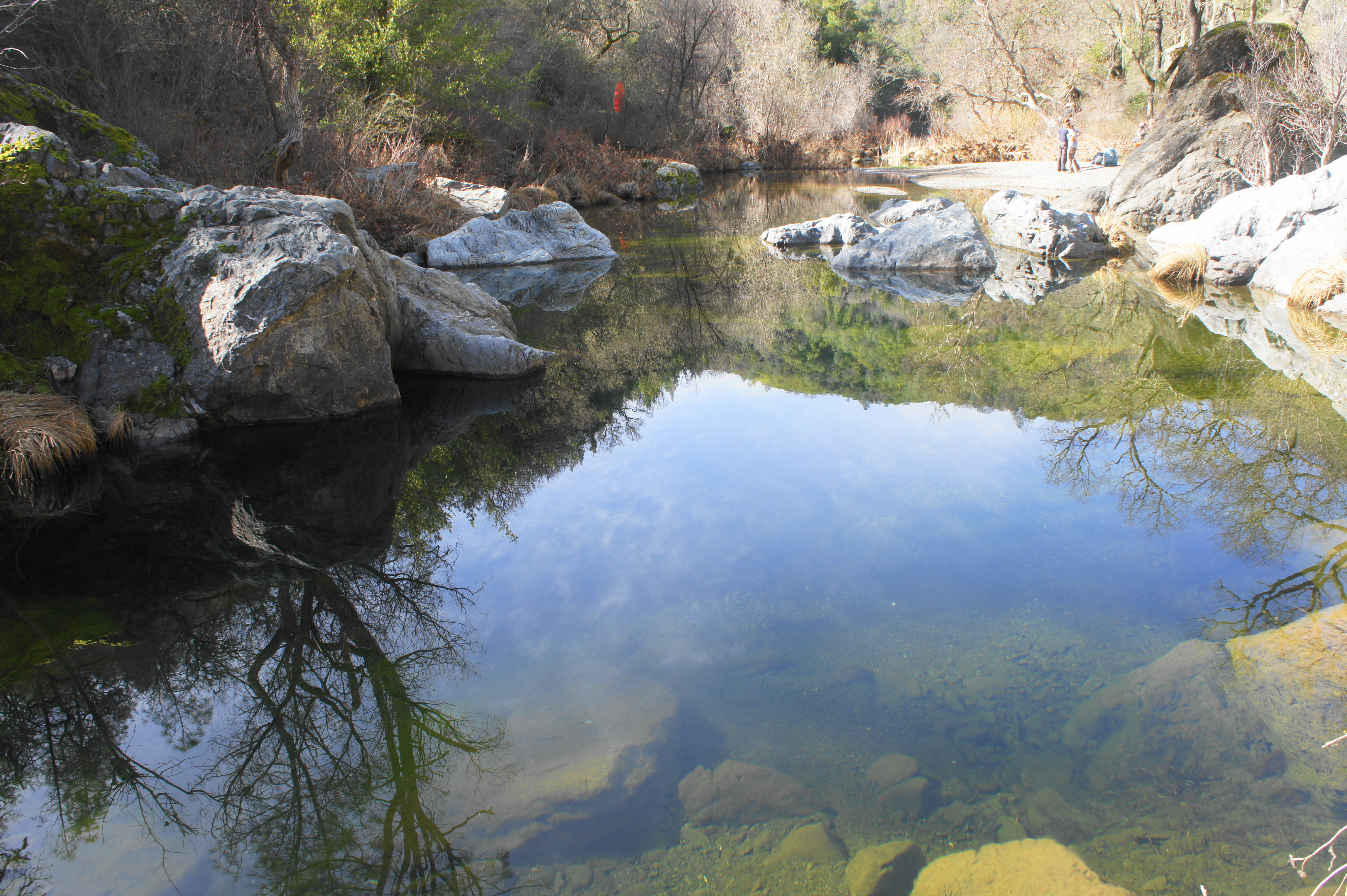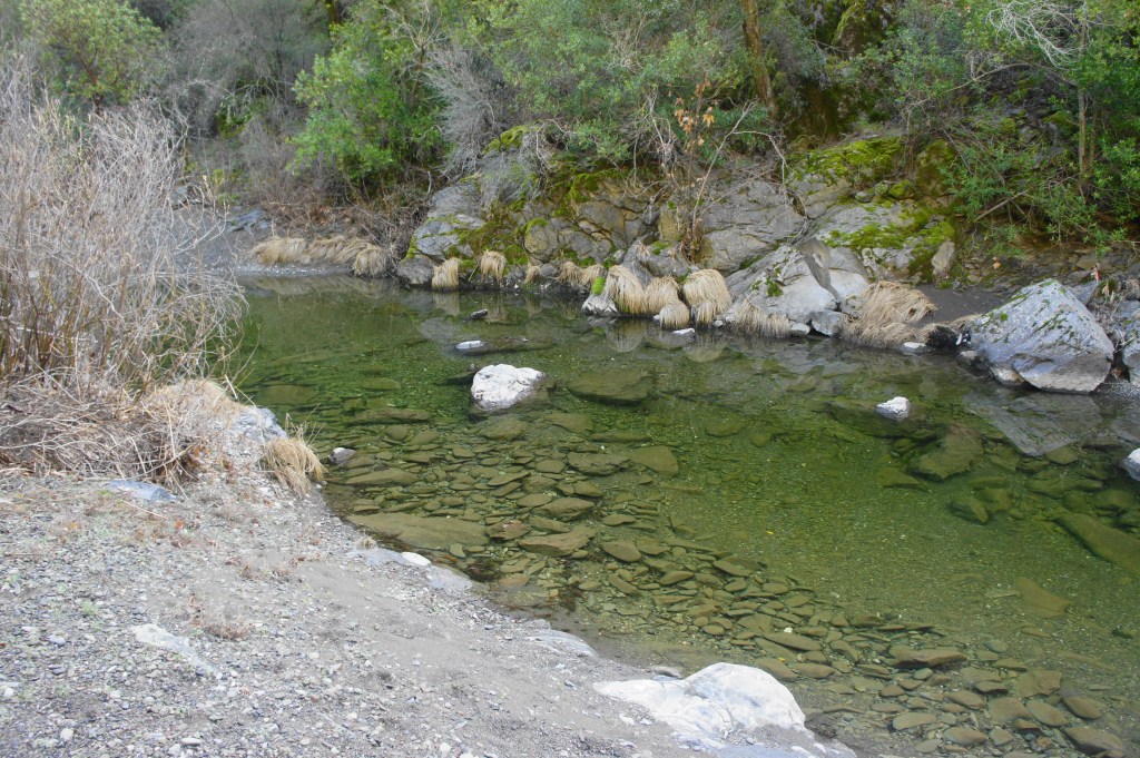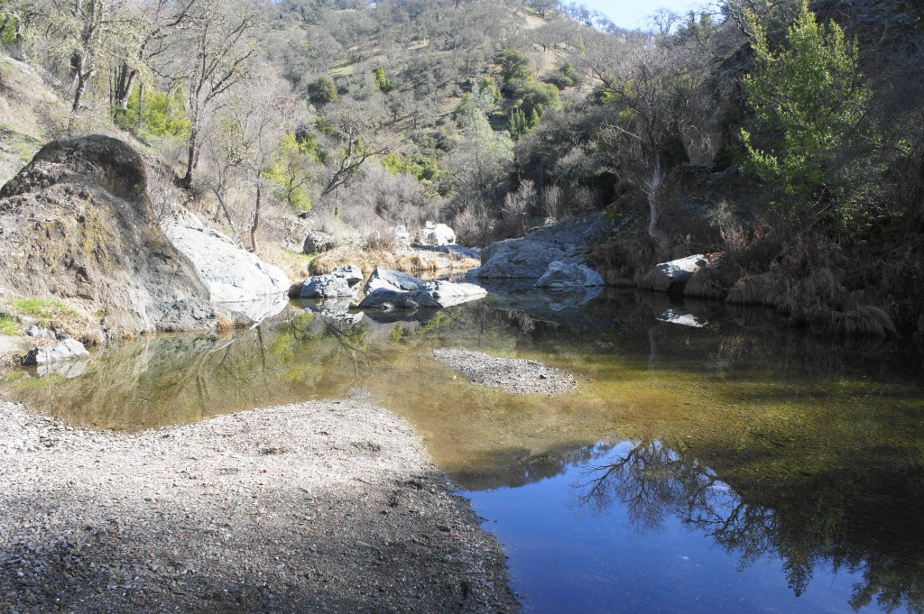 China Hole is a popular camping destination, as well as a local swimming hole in summer. The pool drops as far as 7 to 8 feet deep, yet the spring-fed waters are often crystal clear, making the area an attractive and surprising sight in this otherwise scrubby area of the Diablo Range.
