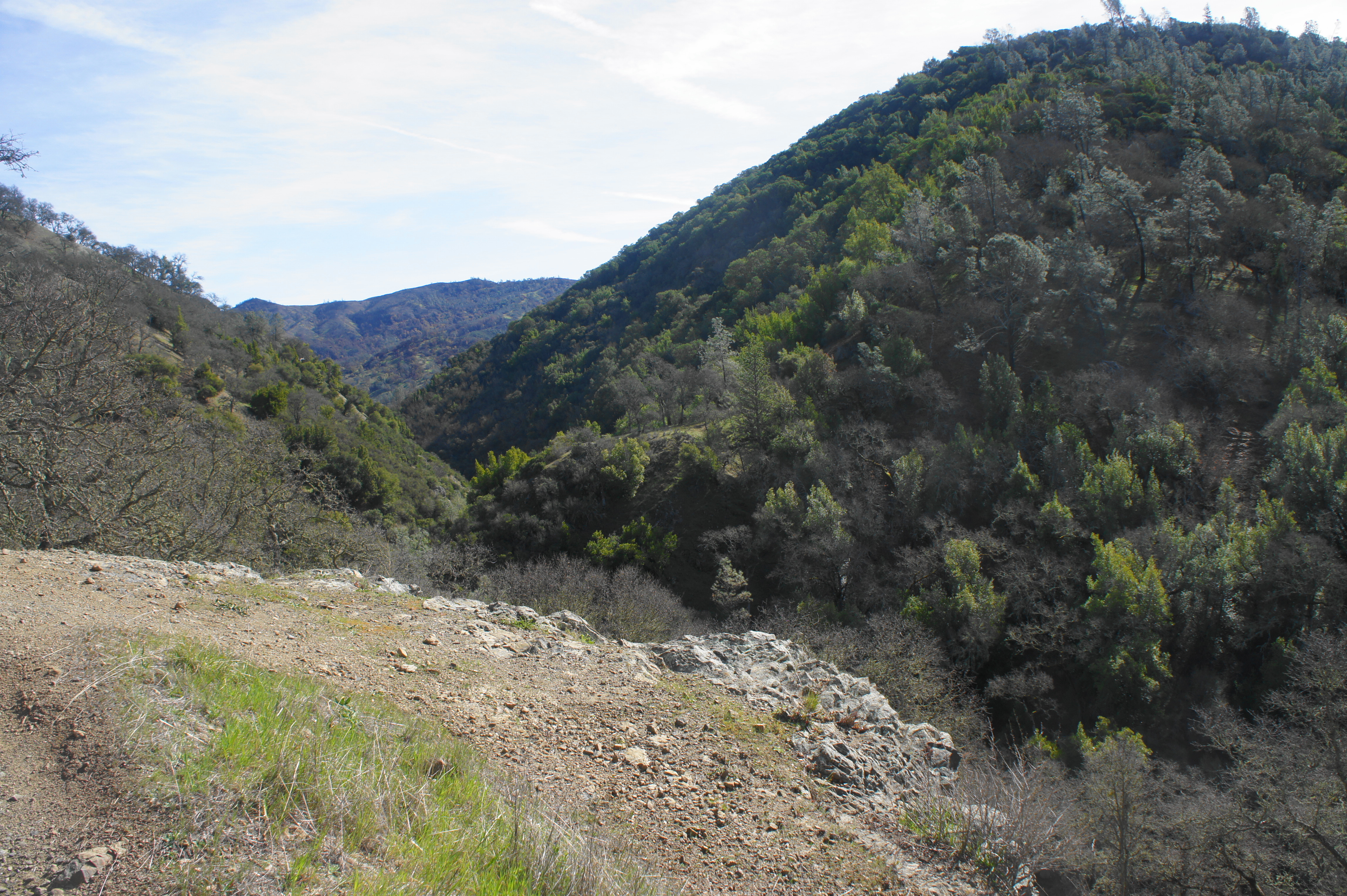 After exploring the stony ledges around China Hole, head back the way you came to the junction with the trail to Madrone Soda Springs. Head right on the China Hole Trail, which begins a scenic climb back toward Manzanita Point, rising quickly to a set of bluffs with expansive views across the Coyote Creek drainage to Jackass Peak (1,784’) and the Narrows area, where the East Fork of Coyote Creek comes in from the east.