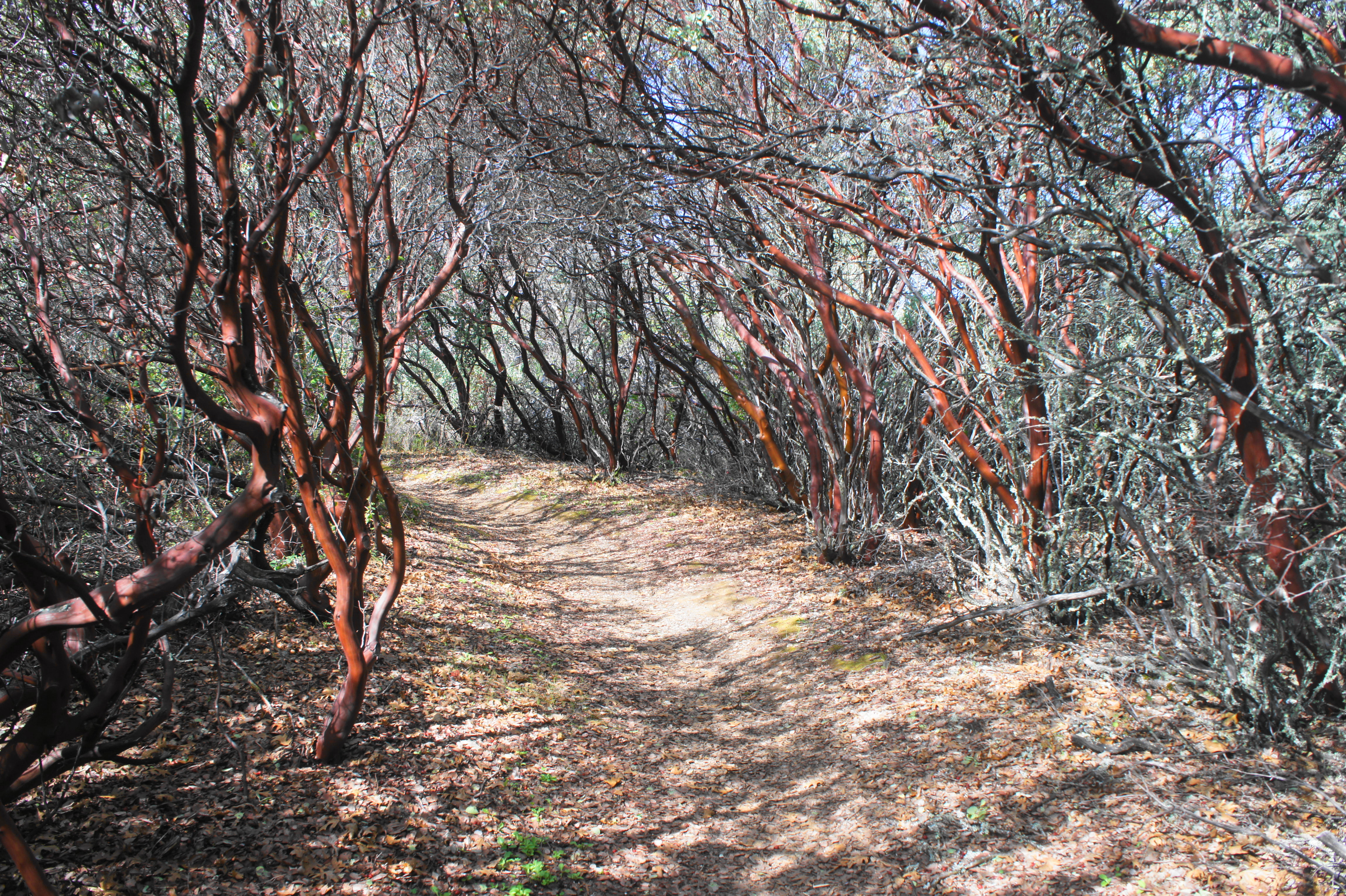 Stay left at the junction with the Lion Spring Trail, then weave in and out of a set of spring-fed gullies, gradually descending to a second junction with the Manzanita Point Road at 1.8 miles. This time, onward travel requires temporarily leaving the single-track and heading southeast on the fire road en route to the Manzanita Point Group Camps. The next half-mile is somewhat drab as the wide track gradually sheds elevation, passing spurs to the Blue Oak Horse Camp, Bass Pond, and Group Camps #1-5. At about 2.6 miles, in the heart of the group camp area, there is a pit toilet, water station, and a four-way junction. Bear right, just beyond the toilet, leaving the road in favor of the narrow Madrone Soda Springs Trail.