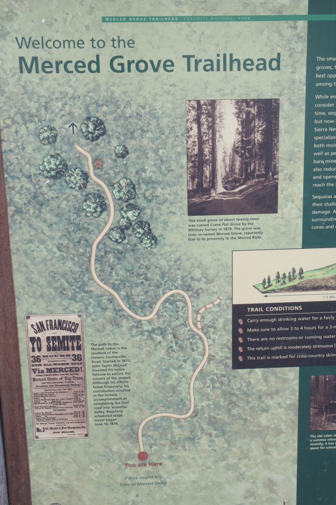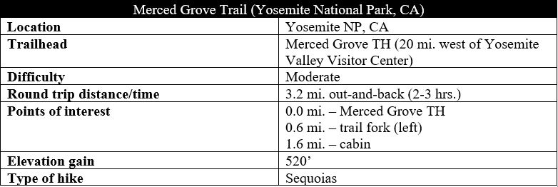 Commensurate with its relative popularity, the Merced Grove Trailhead has a very small parking lot situated off Big Oak Flat Road, between Hodgdon Meadow and Crane Flat in the western reaches of Yosemite National Park. There are restrooms and bear lockers at the trailhead. From the parking area, follow the wide track as it treads south and then west, skirting a burned area on the left, charred by one of the area’s many recent wildfires. After 6/10 mile of mostly level walking, hikers reach a signed junction, with a smaller track bearing left.
