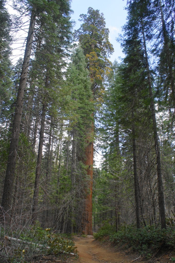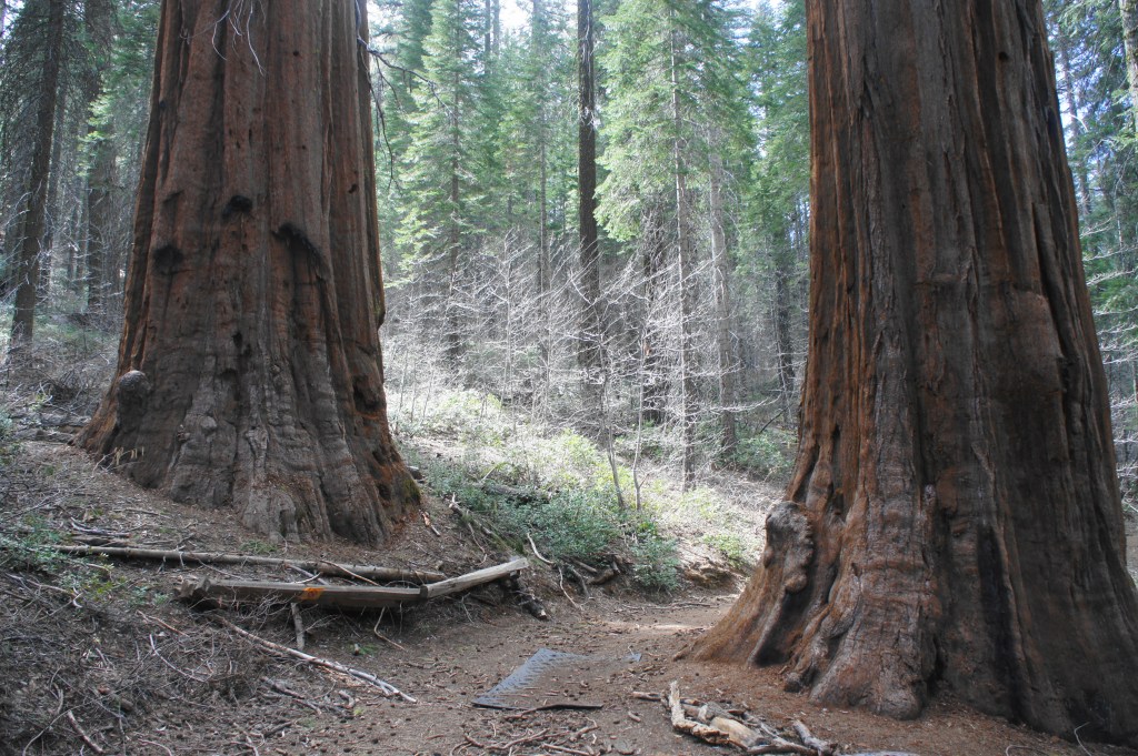 An initial grove of modestly large sequoias is nonetheless very impressive due to the high concentration of these dazzling, orange-hued trees. Just beyond, as the trail continues southward, hikers pass between two of the silent sentinels—look but don’t touch!—and skirts a third on the left.