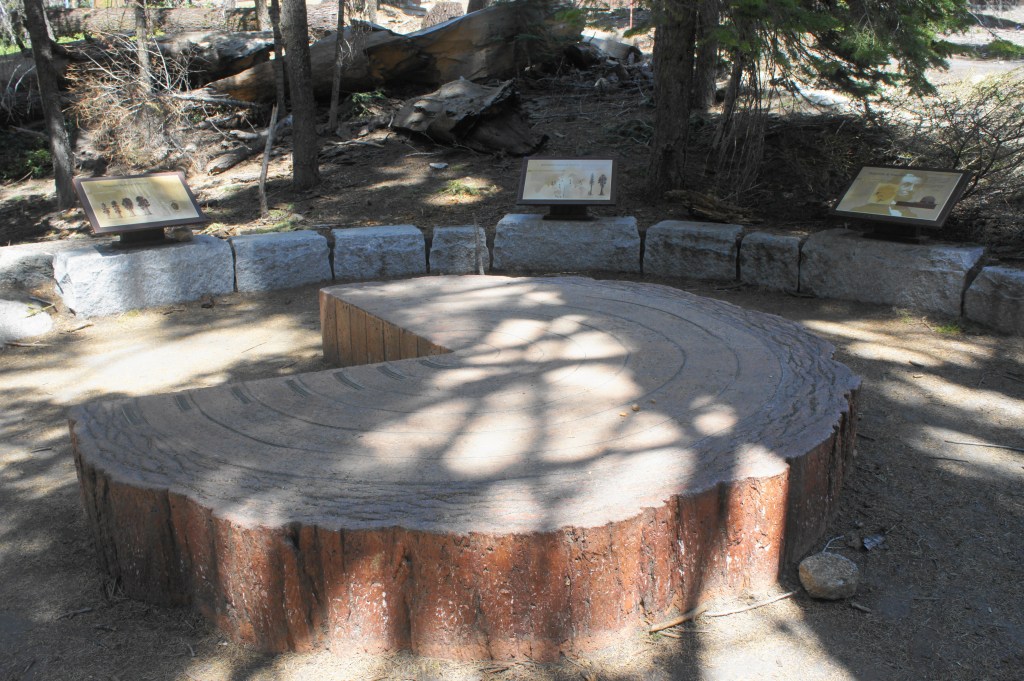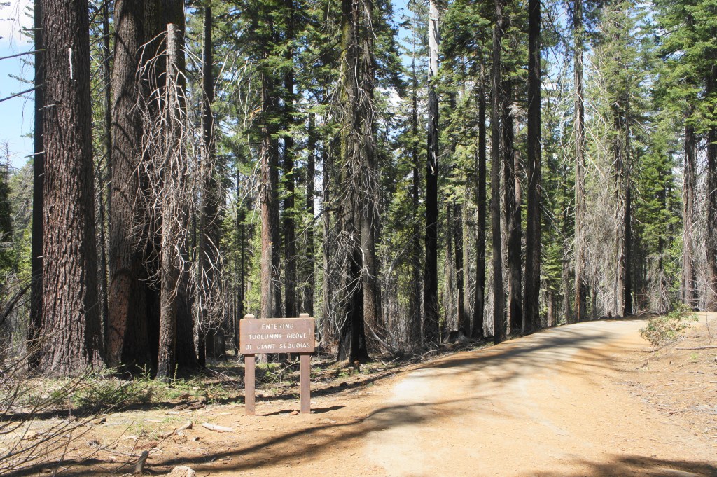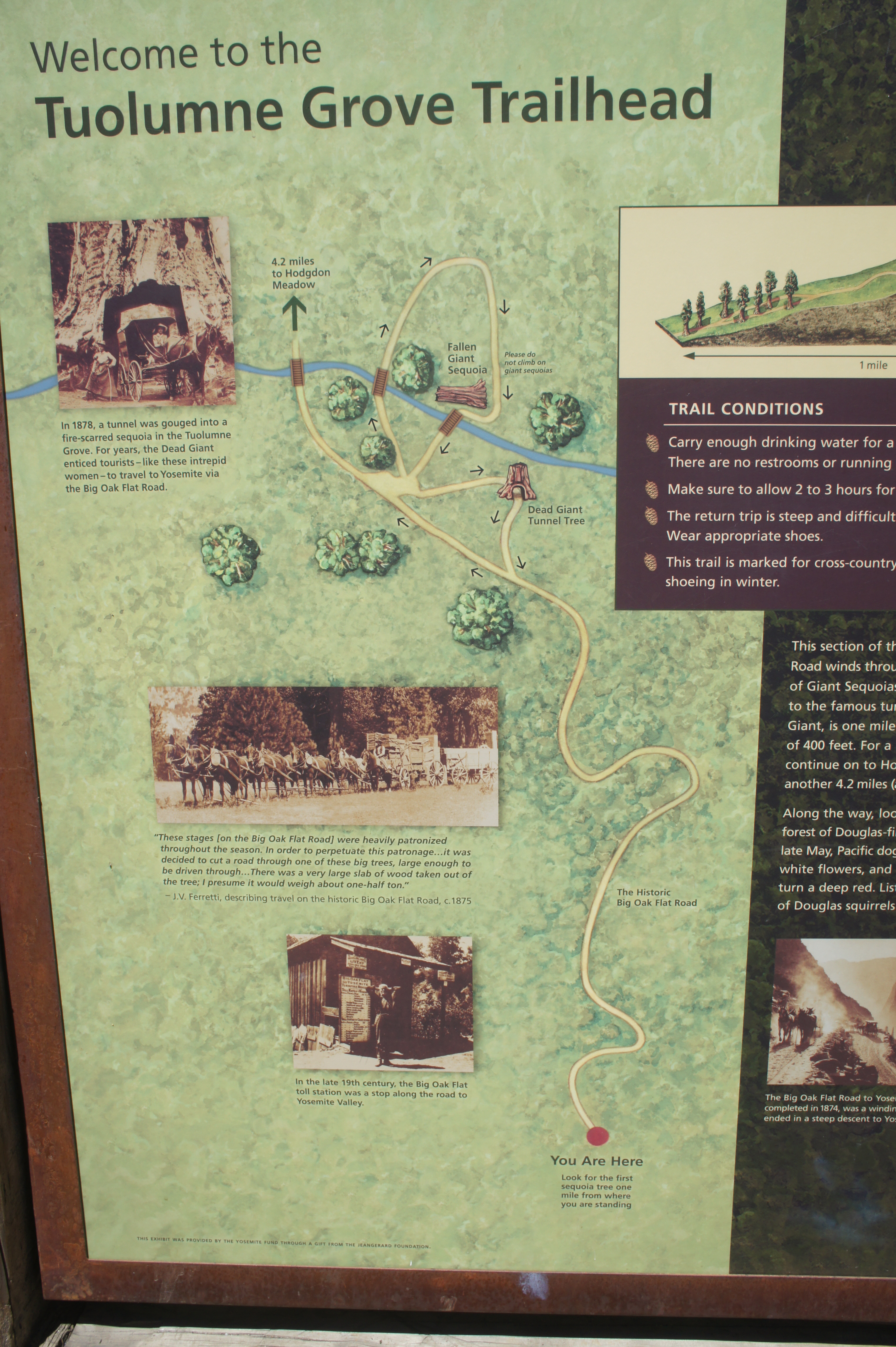 Real living sequoias are not yet visible as the wide, asphalted Tuolumne Grove Road (or Old Big Oak Flat Road) begins to snake its way down the forested slope. Instead, the landscape is dominated by sugar pines and white firs. The steady downhill is a pleasant and easy walk (but remember, you’ll be returning this way, recovering the 500-foot elevation loss on the way back). At 7/10 mile, the old road rounds a sharp left-hand bend, where an information wayside offers more historical detail on the 19th century Old Big Oak Flat Road.