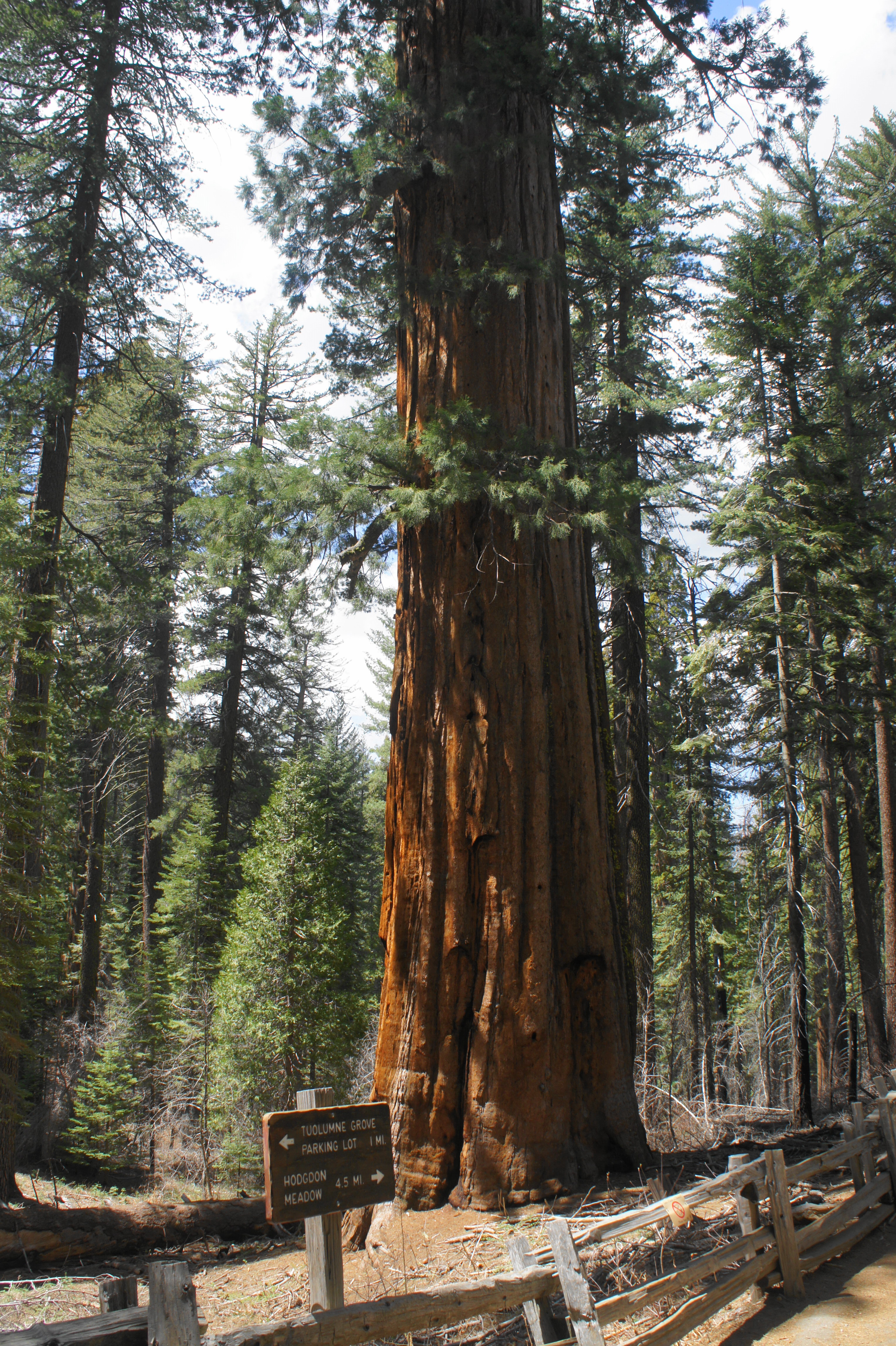 Giant sequoias, close cousins of coast redwoods, are the largest trees (by total volume) on earth and grow naturally only in 75 groves on the western slopes of the Sierra Nevada in California. Three such groves can be found in Yosemite National Park: Mariposa, Merced, and Tuolumne. Situated partway down a north-facing slope above the North Crane Creek drainage, Tuolumne Grove comprises around two dozen mature sequoias and is a popular destination in the western reaches of Yosemite. The route to the grove traces a portion of the Old Big Oak Flat Road, an early tourist track that predates the park, before culminating at a double-loop around the small but pleasant stand of towering trees.