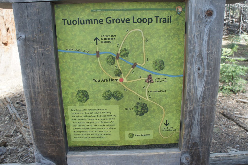 At 9/10 mile, hikers are formally welcomed to Tuolumne Grove with a large-scale map and an entry sign. But it is another 150 yards or so until hikers get their first glimpse of an orange-hued sequoia down in the gully to the left. A minute later, the trail drops to the base of the giant sequoia, likely the largest in the area, known as “Big Red.” Here there is also a junction, with the end of the Grove Loop popping out from the right. Stay straight on the main road.