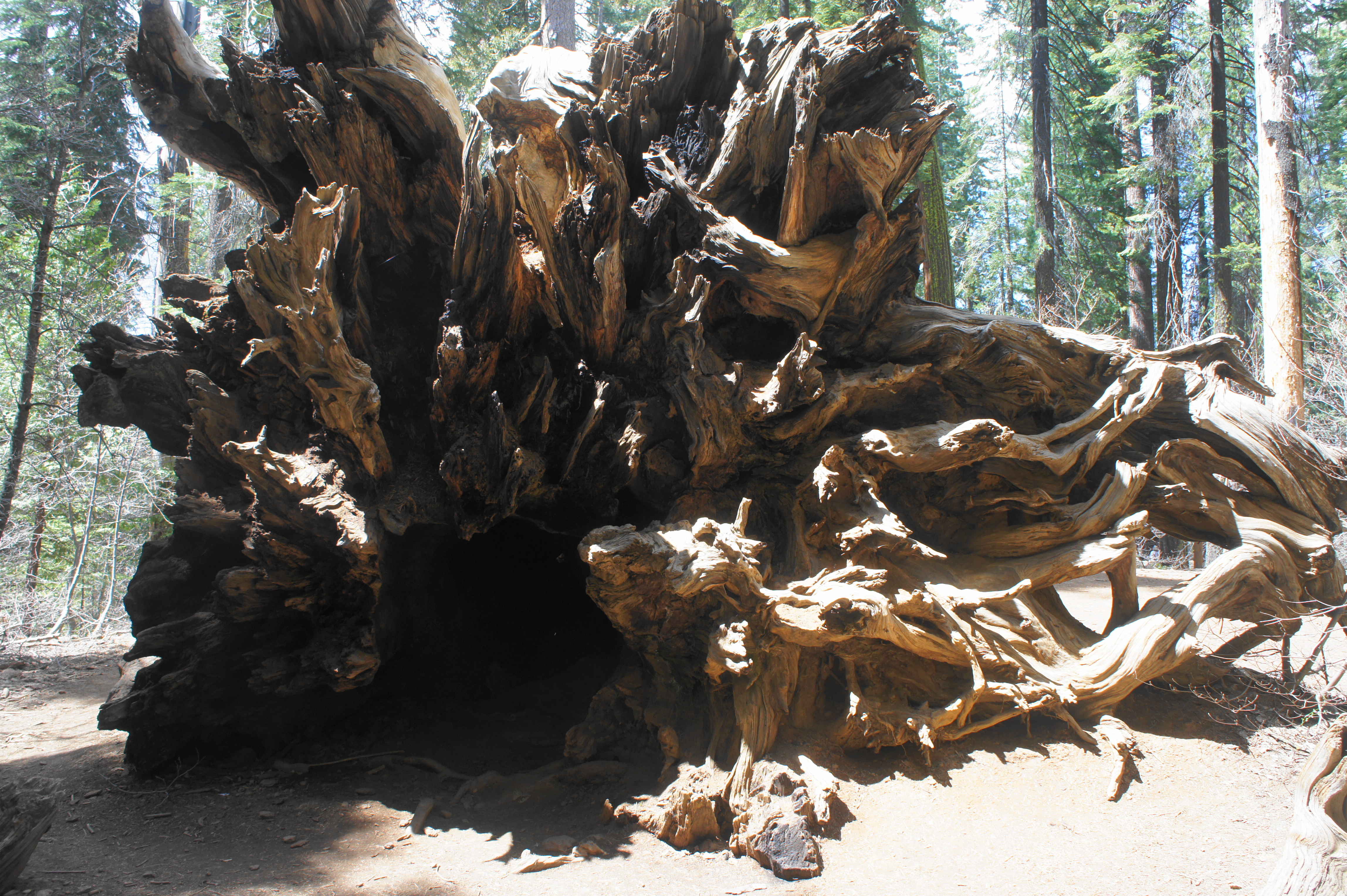 Just beyond, the trail drops to a massive fallen sequoia, revealing its wily root system and a hollow core. Curiously, for such large trees, sequoias have rather shallow roots, making them vulnerable to collapse amid heavy snow or wind.