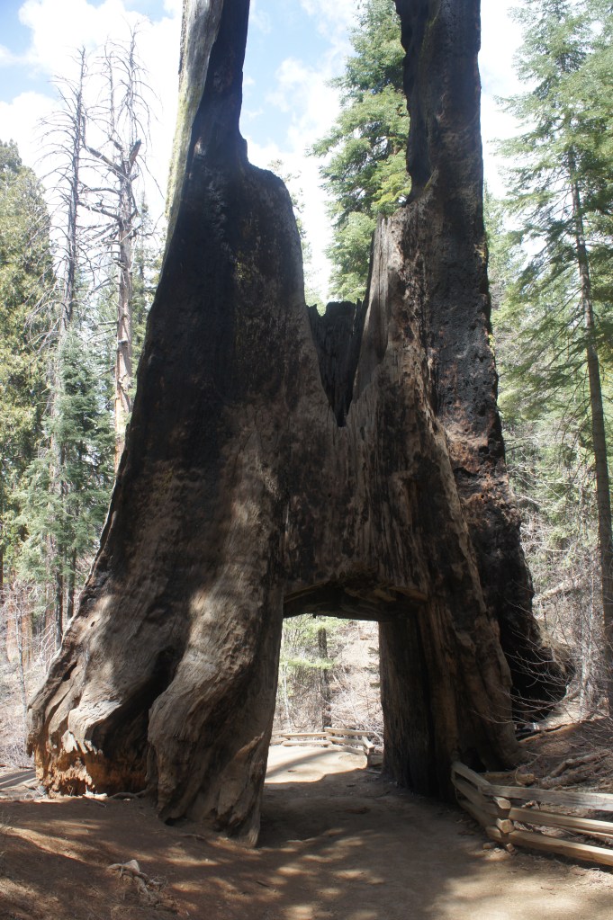 Follow the length of the tree as the trail courses onward and then drops back to another wooden bridge and the picnic area. Instead of getting back on the road, bear left on the Grove Loop continuation, a narrow path rising up the remains of an old paved track to the Dead Giant Tunnel Tree, a former drive-through tree that is now a carved-out stump. From here the trail rises to another pair of close-up sequoias but then drops back to the Old Big Oak Flat Road.