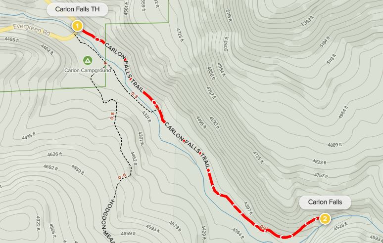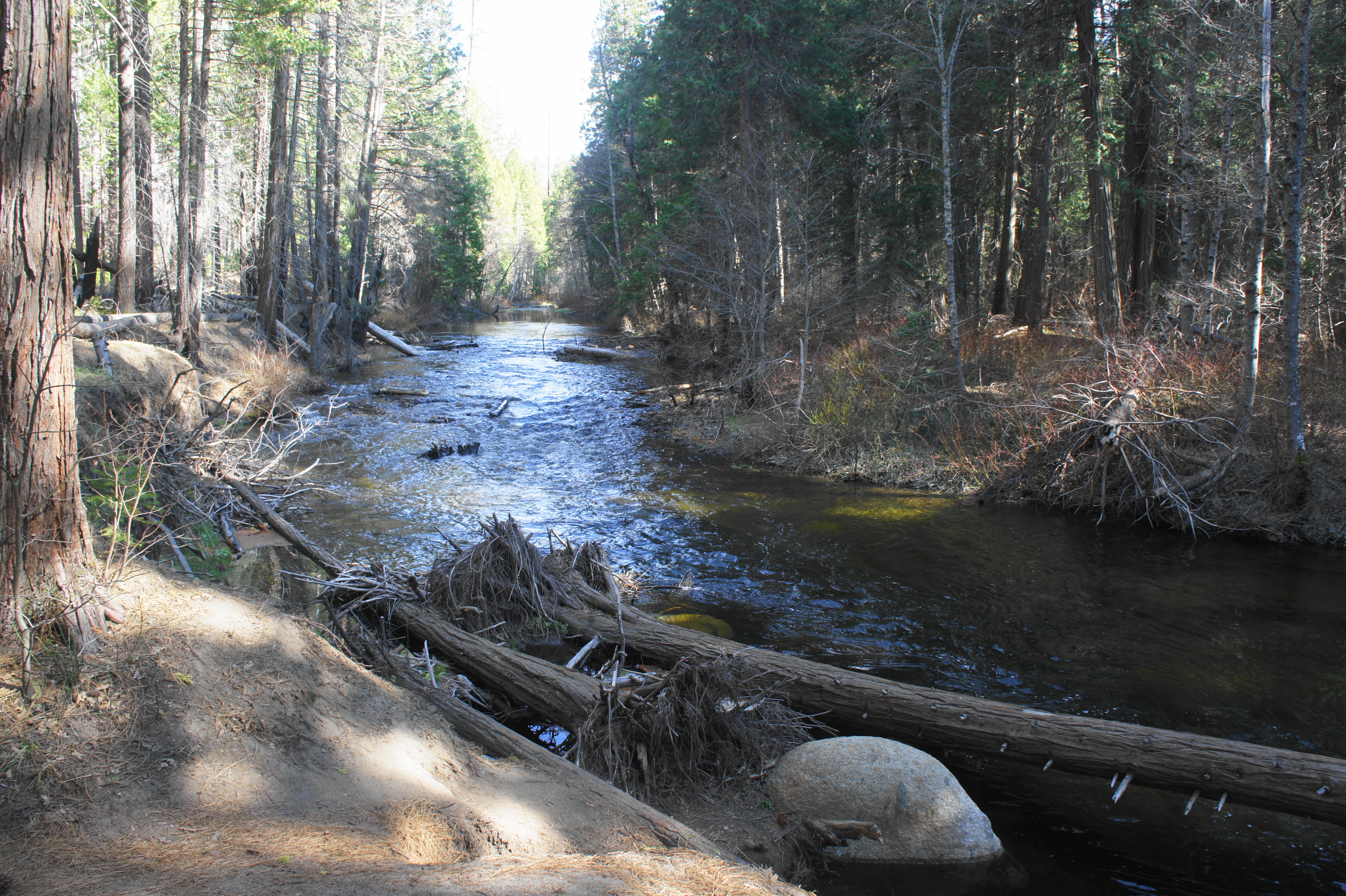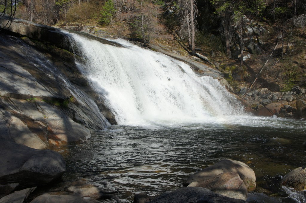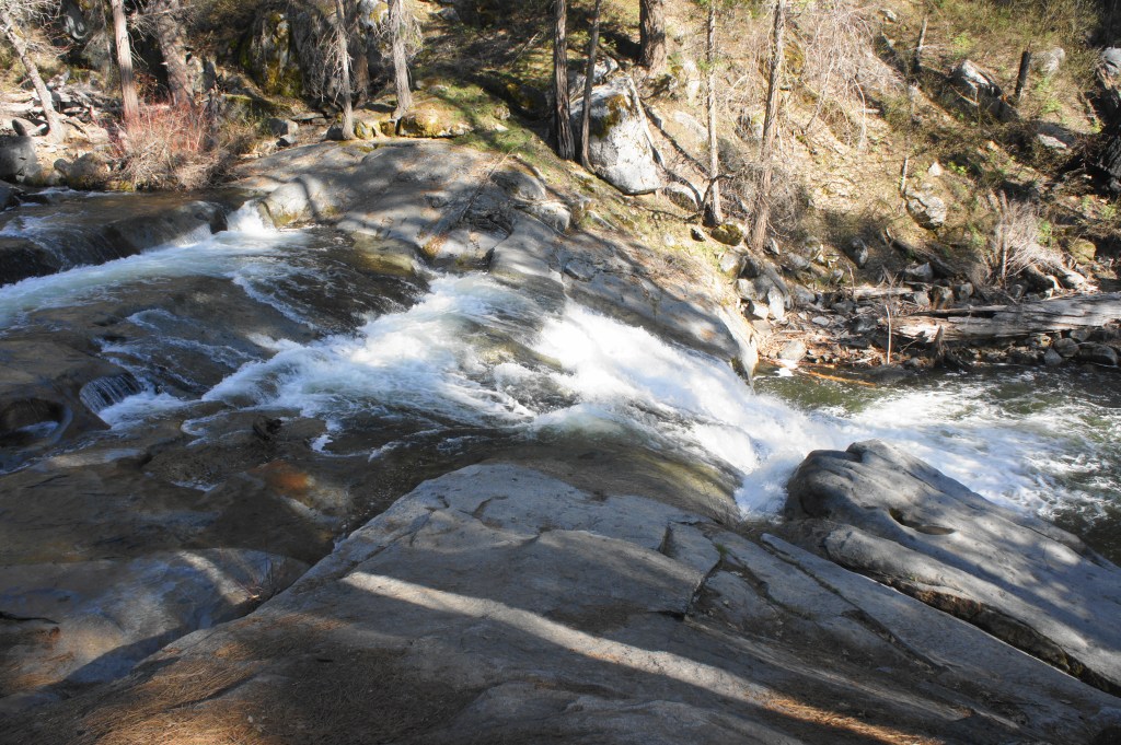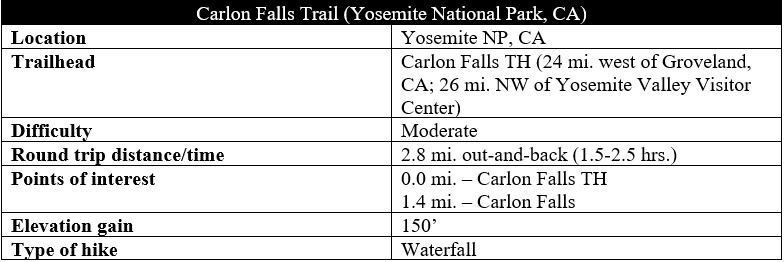 Reaching the trailhead in California’s Stanislaus National Forest requires turning off Big Oak Flat Road onto the north-bound Evergreen Road (a.k.a. Route 12), just over a mile north of the Big Oak Flat Entrance Station in Yosemite National Park. Evergreen Road snakes roughly eastward for a mile, then crosses a bridge over the South Fork of the Tuolumne River, where there are three separate parking areas, which can be somewhat confusing. Eschewing the turnoffs for the Upper and Lower Carlon Day Use Areas along the south bank, proceed across the bridge and park in the small lot on the right – it is marked “Carlon Falls.” (Note: If full, park in one of the day use areas.)