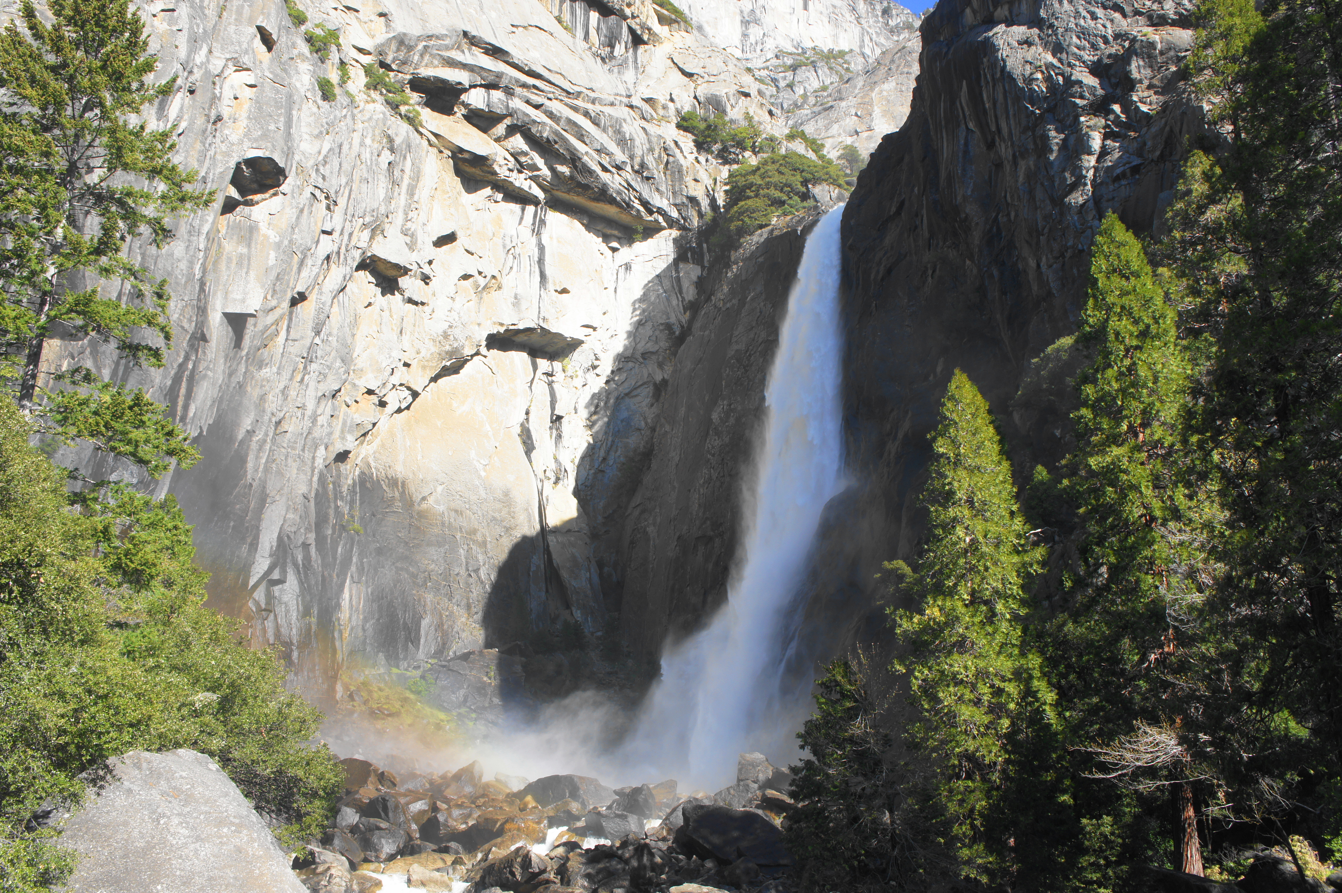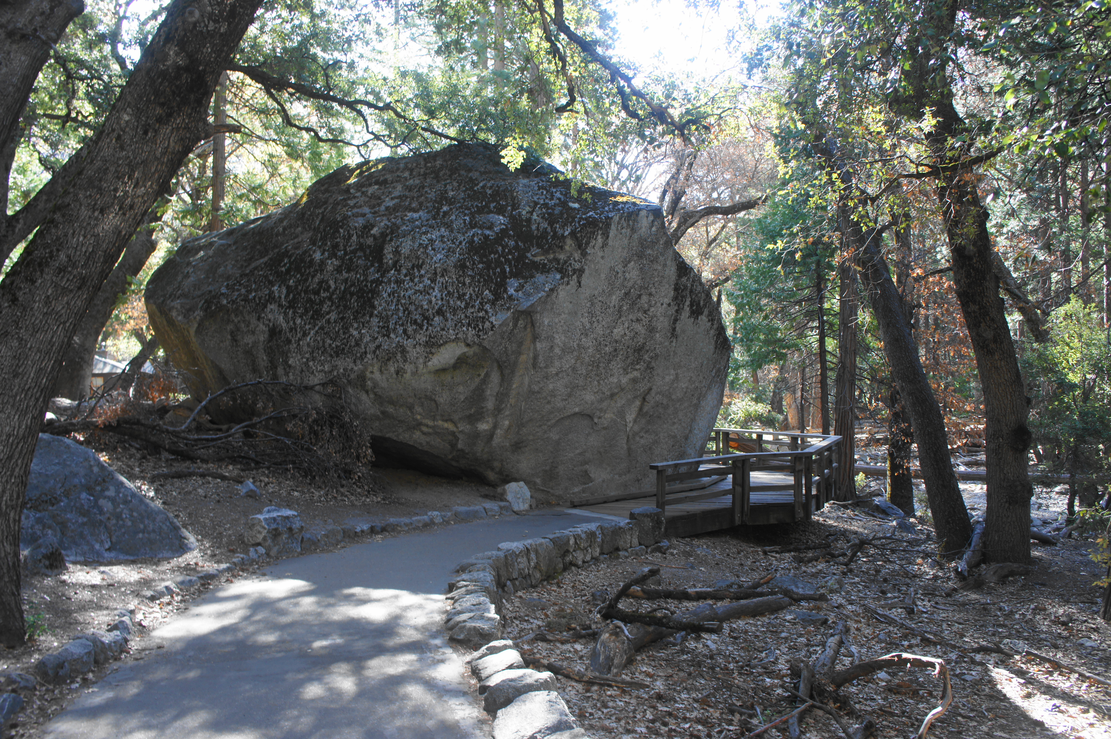 At about 4/10 mile, the incline steepens to about a 14% grade, which is technically not wheelchair-accessible but probably still doable for most wheelchairs with assistance. The path rises to another bridge leading over Yosemite Creek, offering a closer view of 320-foot Lower Yosemite Falls (the Upper Falls are temporarily obscured from view). This is a popular area and often extremely crowded, unless one arrives very early or late in the day. After crossing the bridge, the now-narrower trail continues eastward, winding around conifers and large boulders. After passing a huge granite chunk on the left, the trail splits, with the Valley Loop Trail continuing left, while the route back to the start heads right.