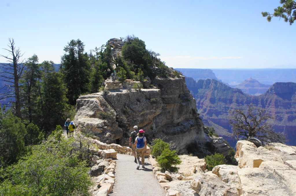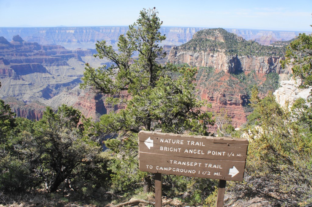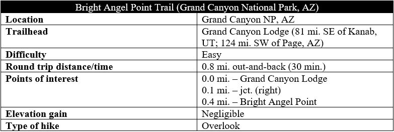 Arizona’s magnificent Grand Canyon National Park has a lot going for it, although perhaps creative naming conventions is not one of them. One of the most ubiquitous names for various features in the park is “Bright Angel”: south of the Colorado River, the popular Bright Angel Trail descends from the Bright Angel Lodge on the South Rim to Phantom Ranch, while the congruously-named Bright Angel Canyon leads north from the Colorado, past the Bright Angel Campground, all the way to the North Rim. Here on the northern rim of the Grand Canyon is one last kindred namesake: Bright Angel Point, a panoramic overlook situated at the far extremity of a narrow jut of land more than 3,500 feet above the canyon below. The ¼-mile Bright Angel Point Trail is by far the most popular “hike” on the North Rim and offers an introductory—though not necessarily the best—view of one of the world’s most famous natural wonders.
