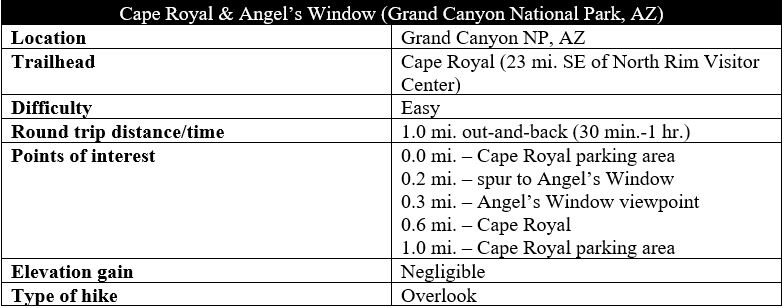 Cape Royal is truly one of the most exceptional viewpoints at the Grand Canyon and well worth the lengthy drive and short walk. After walking to both the Cape Royal and Angel’s Window vistas, return to the trailhead, capping off a one-mile jaunt.