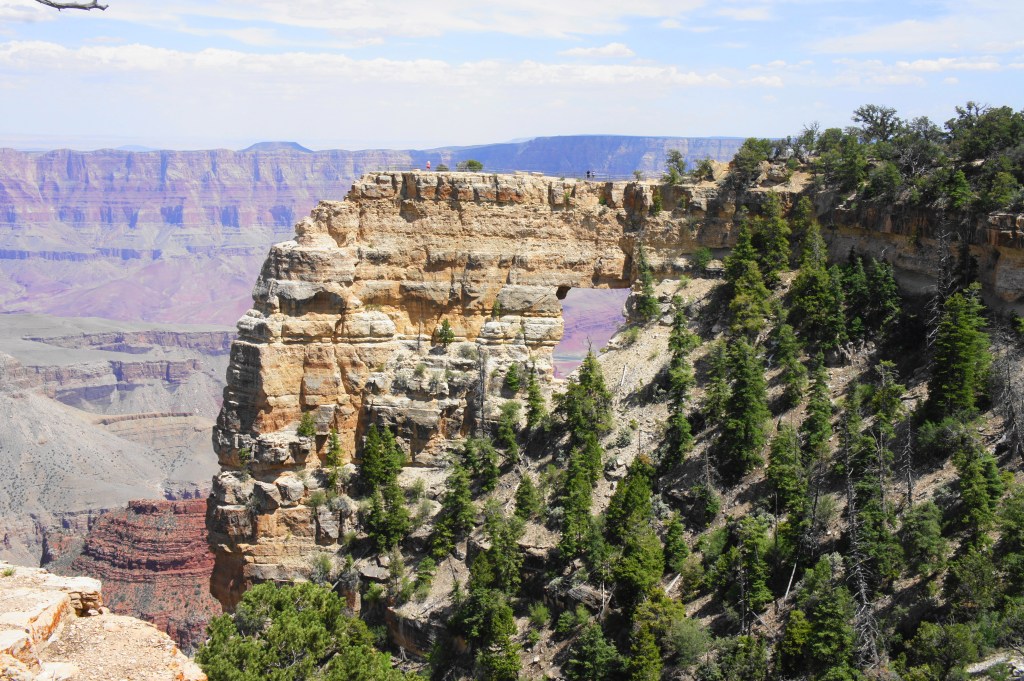 The paved trail begins by crossing a level stretch of land dotted with the area’s ubiquitous pinyon pines and junipers, as well as sagebrush, cliffrose, and currant. Interpretive signs offer detail on the local flora, while the views begin to open up at around 1/10 mile. Here, off to the left, is a terrific initial overlook, where hikers can get an excellent view of Angel’s Window, the triangle-shaped natural arch which captures the blue-green Colorado River in its frame. This wonder is the product of freezing and thawing, which accelerated erosion of the Kaibab limestone along the North Rim.