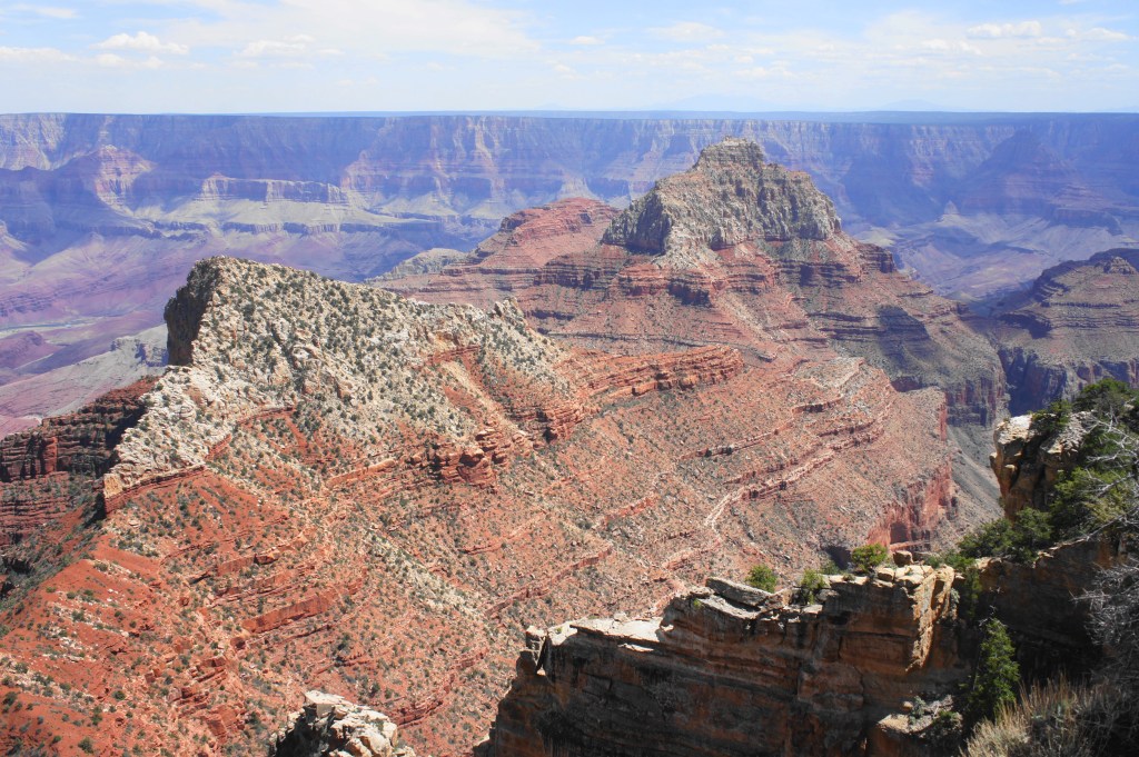 Returning to the main trail, bear left and continue south for 2/10 mile to Cape Royal, stopping at an unofficial (and unfenced!) viewpoint on the left, which sports great views of Vishnu Temple. The paved trail ends by curling around to a railed-in viewpoint and a smattering of interpretive signs. Dominating the landscape to the southwest is massive Wotans Throne, an iconic fixture of the northern half of the Grand Canyon. Beyond, one can spot Horseshoe Mesa and the Grandview area of the South Rim in the distance. Off to the southeast is Vishnu Temple again.