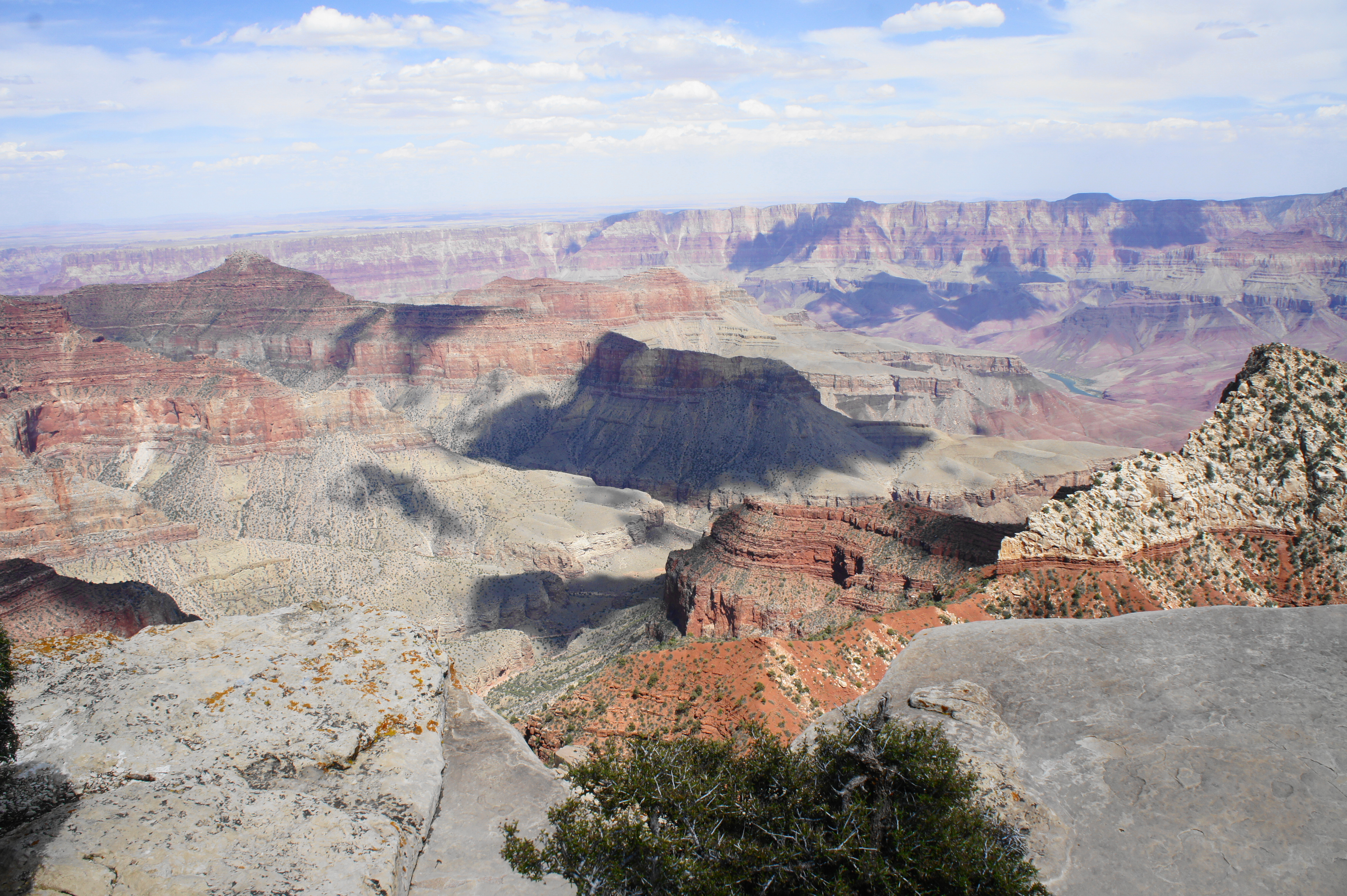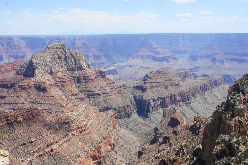 Visitors get great views of several prominent features, including Freya Castle (7,299’), Vishnu Temple (7,529’), and Krishna Shrine (6,115’), as well as one of the best views from the rim of the Colorado River, visible (and sometimes audible) in the distance. Beyond the reddish-grey basin of the Colorado, the walls rise some 3,000 feet to the East Rim, with Cedar Mountain (7,053’) beyond. To the north, one can also see Cape Final (7,916’), Jupiter Temple (7,081’), and the confluence of the Colorado and Little Colorado Rivers beyond.
