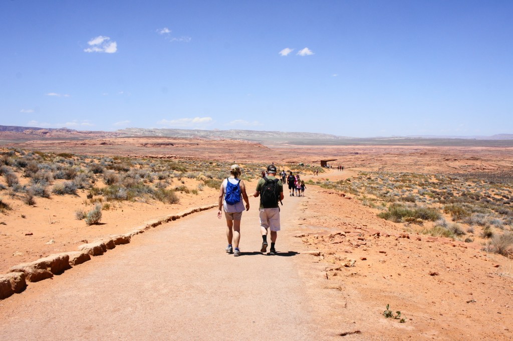 There is now basically only one official trail leading from the parking area: the path to Horseshoe Bend skirts a modest hill on the left, with broad views across the scrubby escarpment north to Lake Powell and Page, with the Vermilion Cliffs off to the northwest. There is little shade on this highly sun-exposed trail, save for two man-made overhangs, the first of which is encountered on the right after 2/10 mile.