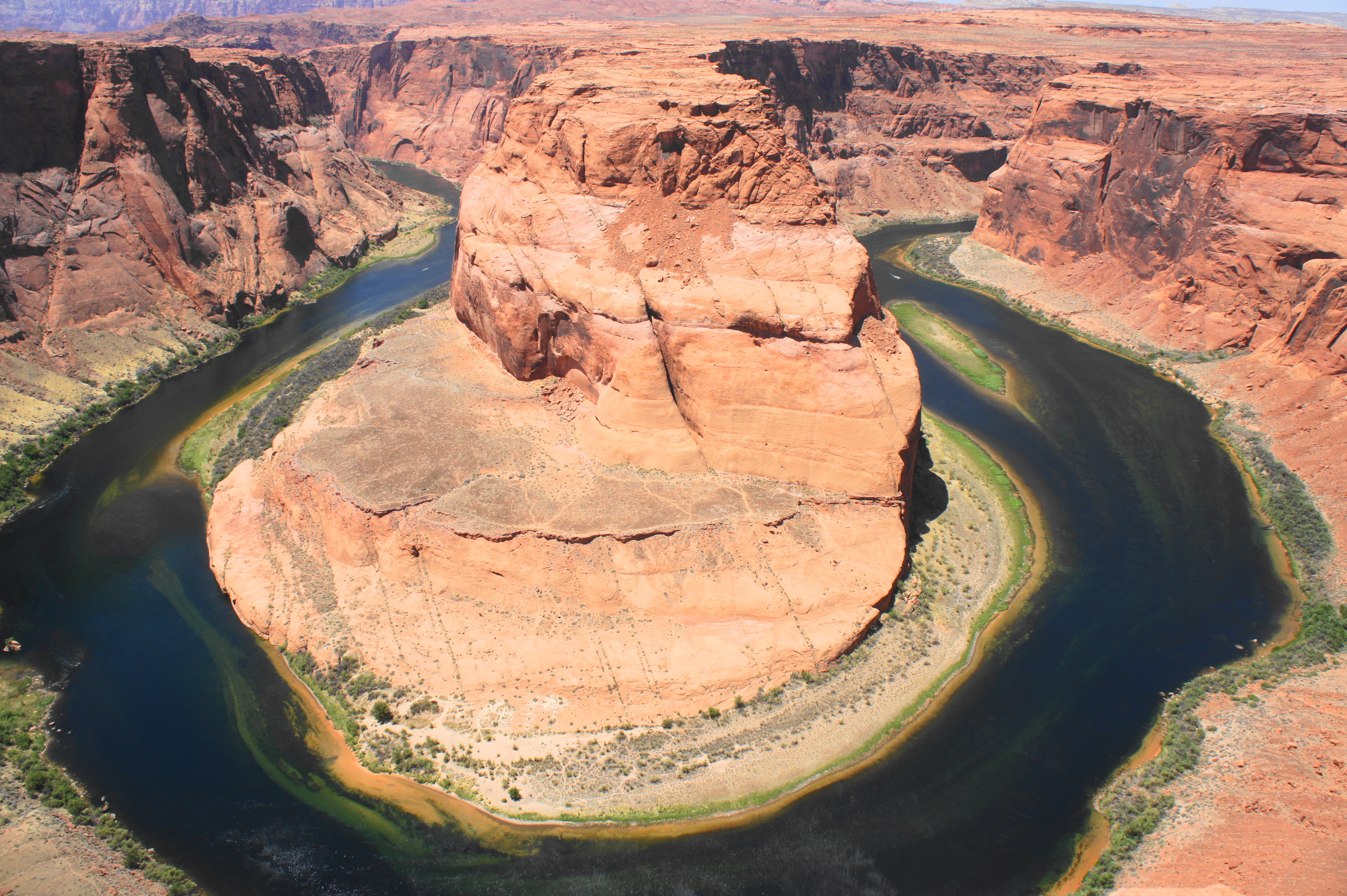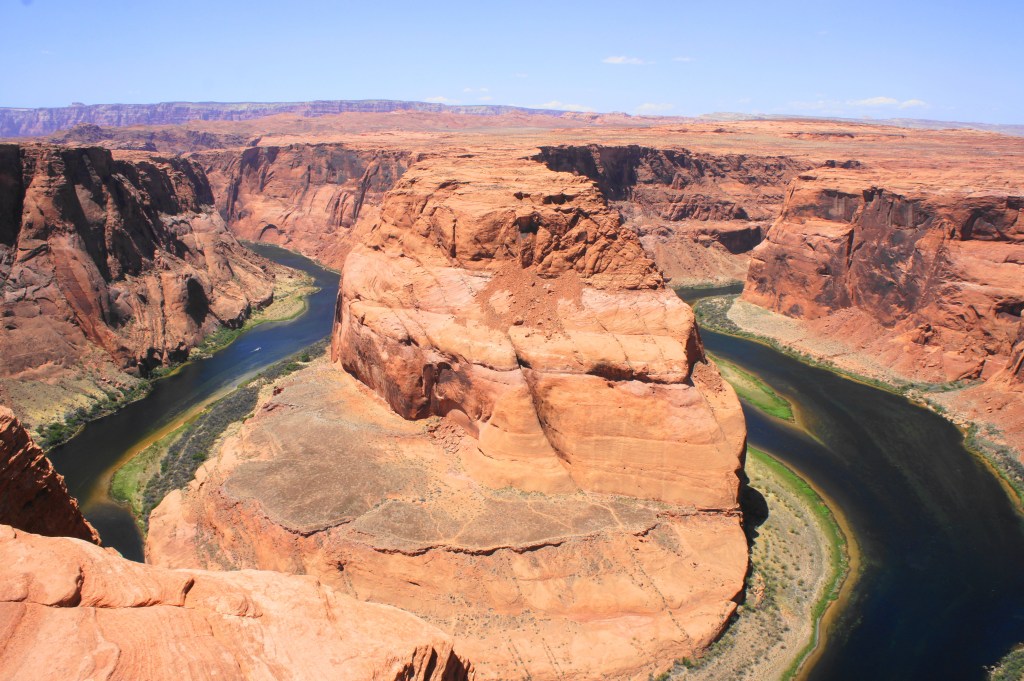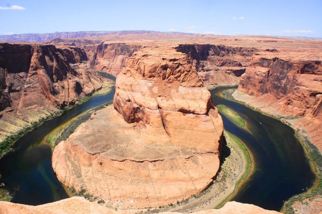 While the main viewing area has a fence for protection, much of the surrounding rim is entirely exposed, with the vertical cliffs of the Navajo sandstone dropping precipitously to the Colorado River. Having encountered a particularly resistant chunk of the bedrock, the river here instead goes around it, forming the incised, or entrenched, meander visible today. Beyond Horseshoe Bend to the west, the flat plateau gives way to the higher cliffs of the Paria Canyon area and the Vermilion Cliffs, formed by older Jurassic period rocks.
