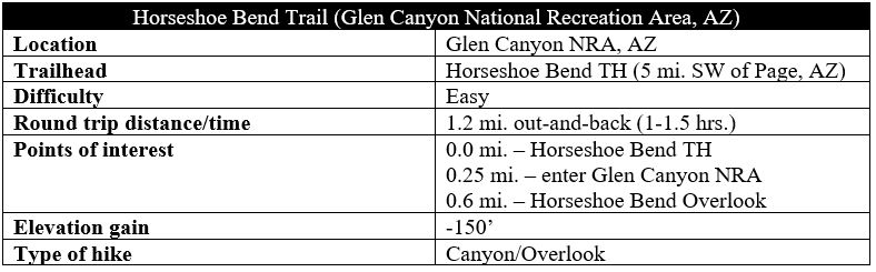 The Horseshoe Bend Trail in Glen Canyon National Recreation Area is situated about 1.6 miles down Highway 89 from its junction with Route 98, just southwest of Page, Arizona. The well-marked turnoff leads to an entrance station, where visitors must pay a $10 parking fee. The massive parking lot beyond often hosts dozens and dozens of tour buses and private vehicles.