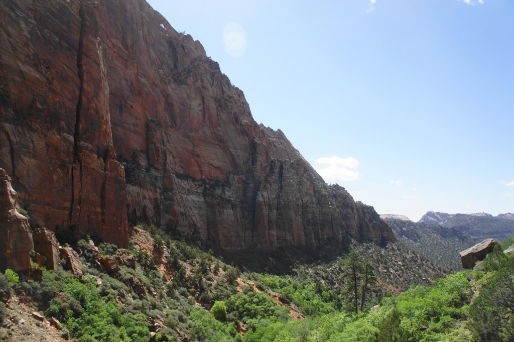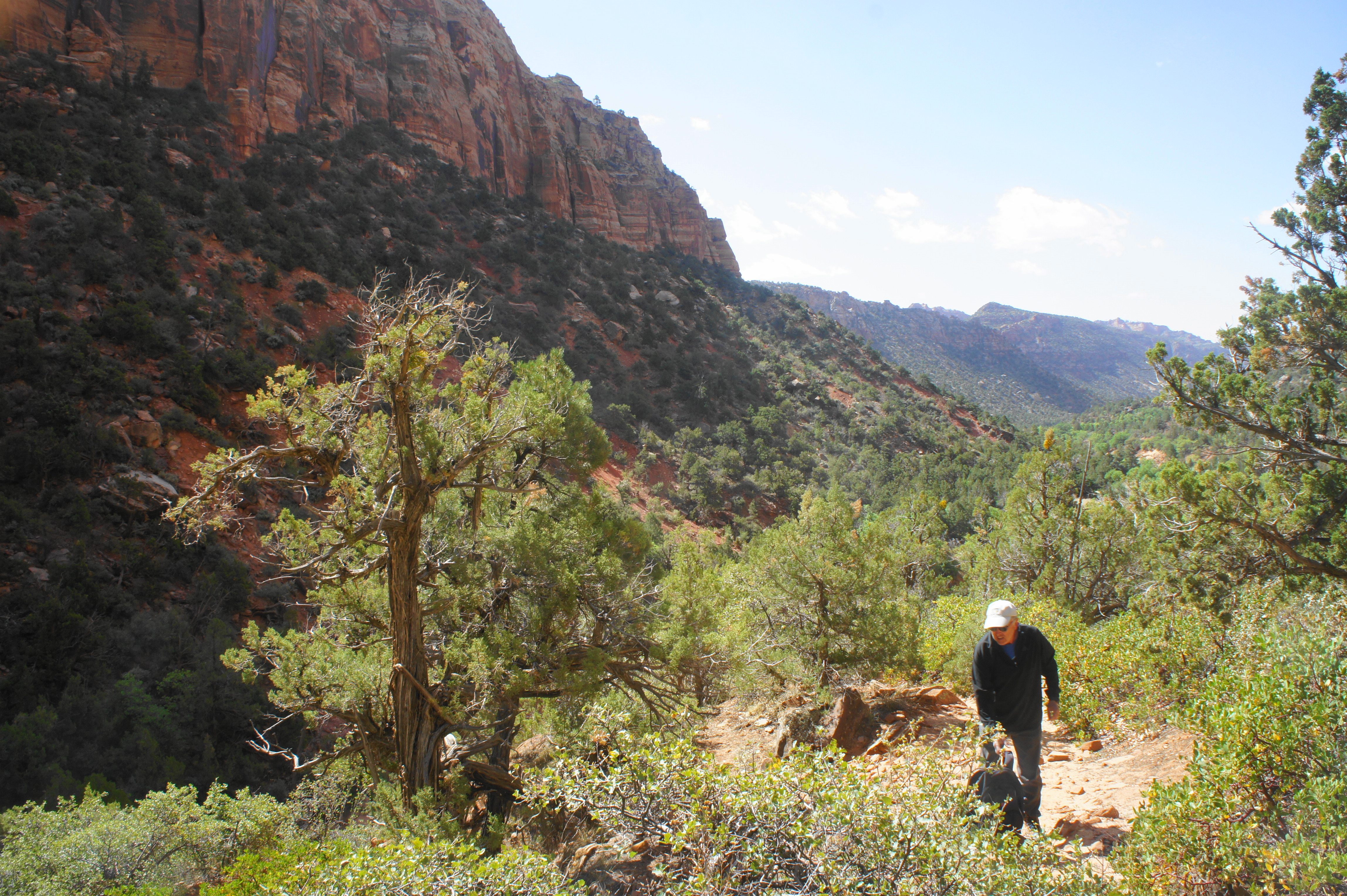 At ½ mile, the trail crests a hill and drops for a brief stretch; one can see minor cascades in the creek down below. The next stretch is somewhat level with brief ups and downs before ascending a rocky patch again and passes a batch of small, green ferns and thorny bushes. From atop a scrubby, sunny hilltop at 7/10 mile, one can see the dark, narrowing canyon ahead, as well as Water Canyon Arch—a high archway situated near the top of the Navajo sandstone cliff to the east.
